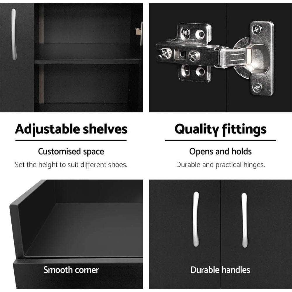 Featuring a paper finish, plastic handles in silver powder coated and a sleek stylish contemporary design, this quality made shoe cabinet easily matches with any d��cor. It's constructed with adjustable shelves in two door cupboard and side storage shelves that can store up to 21 pairs of shoes. Space for your knick knacks? No problem. Just convert the sides to your desire level. Great for organising your favourites, just perfect for your storage needs!