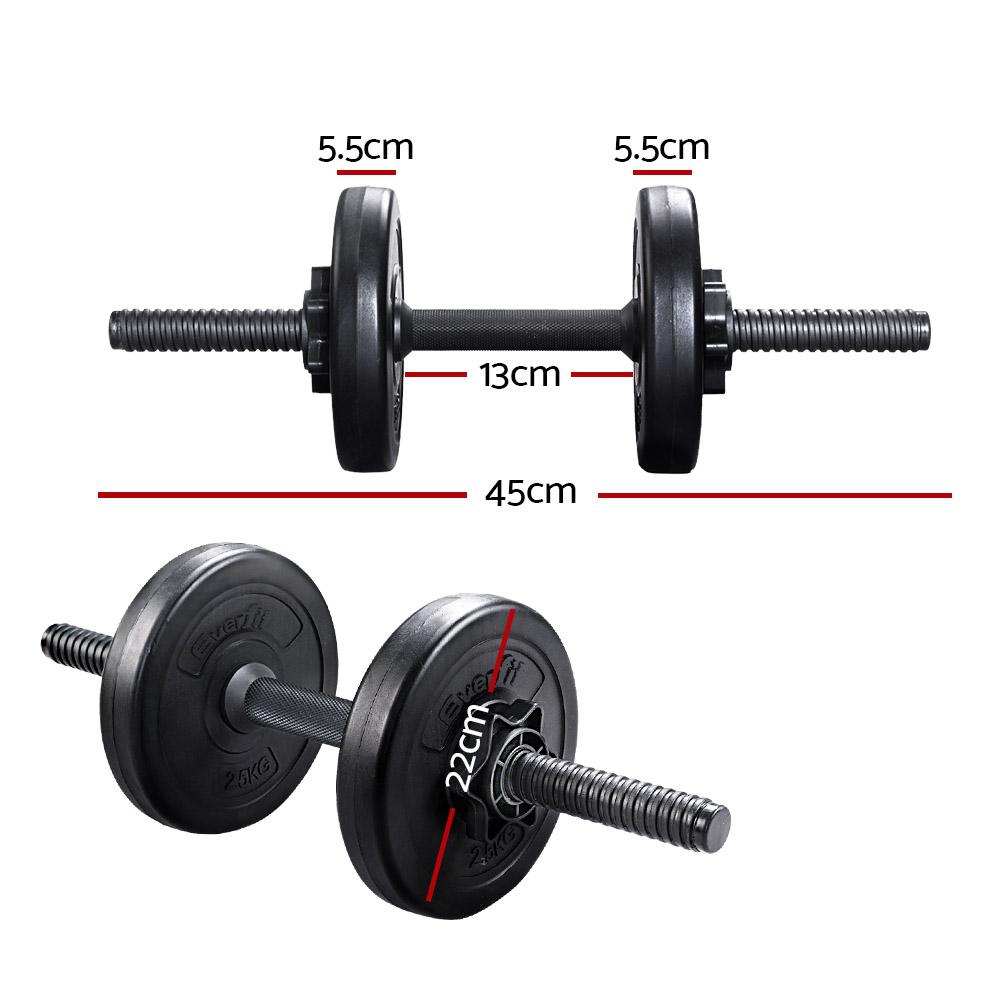 Time to get tough. And our Everfit 12kg Dumbbell Set is the right deal if you are looking to boost those triceps, biceps and shoulders. Or lose some unwelcome fat. Whatever is your game, our dumbbell set lets you strengthen and tone those muscles in pleasing style. The commercial-grade dumbbell features a high-quality bar with non-slip handle that offers optimal gripping surface. Each weight plate weighs 2.5kg and is made of cast cement that is coated with smooth plastic, reducing clanging sounds and making it floor-friendly. You can adjust the weight of the dumbbell by removing the weight plate and only using the dumbbell bar (weighing 1kg each) or adding more compatible weight plates. And the high-quality steel star-shaped nuts ensure the weight plates stay securely in place for safe workouts. Best of all, the dumbbell comes in a set of two (two 6kg dumbbells for 12kg total) so that you can exercise both arms at the same time. Gym junky or workout pro, you can get fit easily with our dumbbell set.