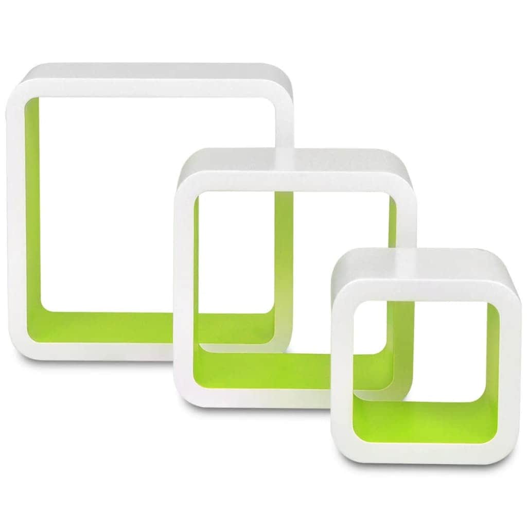3 White-green MDF Floating Wall Display Shelf Cubes Book/DVD Storage
