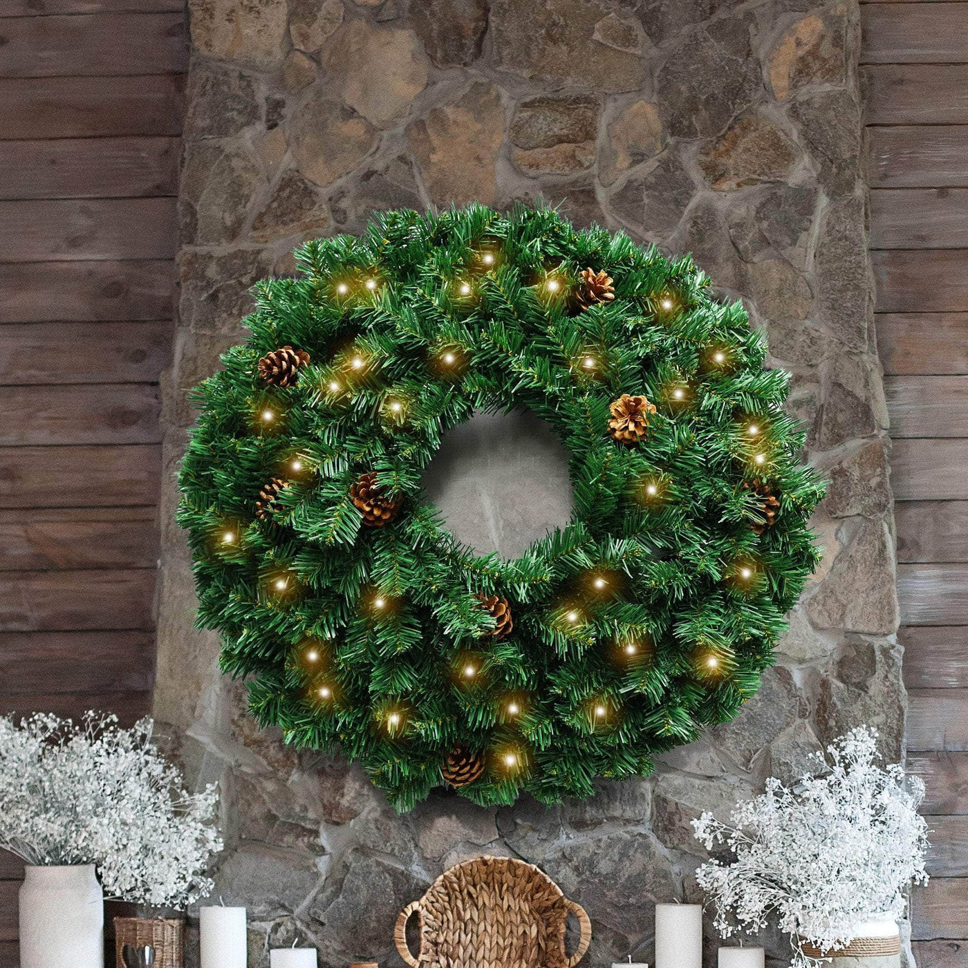 Create a warm and festive ambience in your home with this exquisitely designed Christmas wreath. Featuring lifelike pine cones and warm white Christmas lights, it emits a welcoming and cosy radiance in your entryway. The wreaths abundant and verdant foliage adds a touch of natural sophistication to your decorations, making it an ideal festive touch for your Christmas festivities. Infuse your home entrance with a delightful holiday spirit with this wreath.