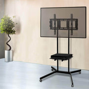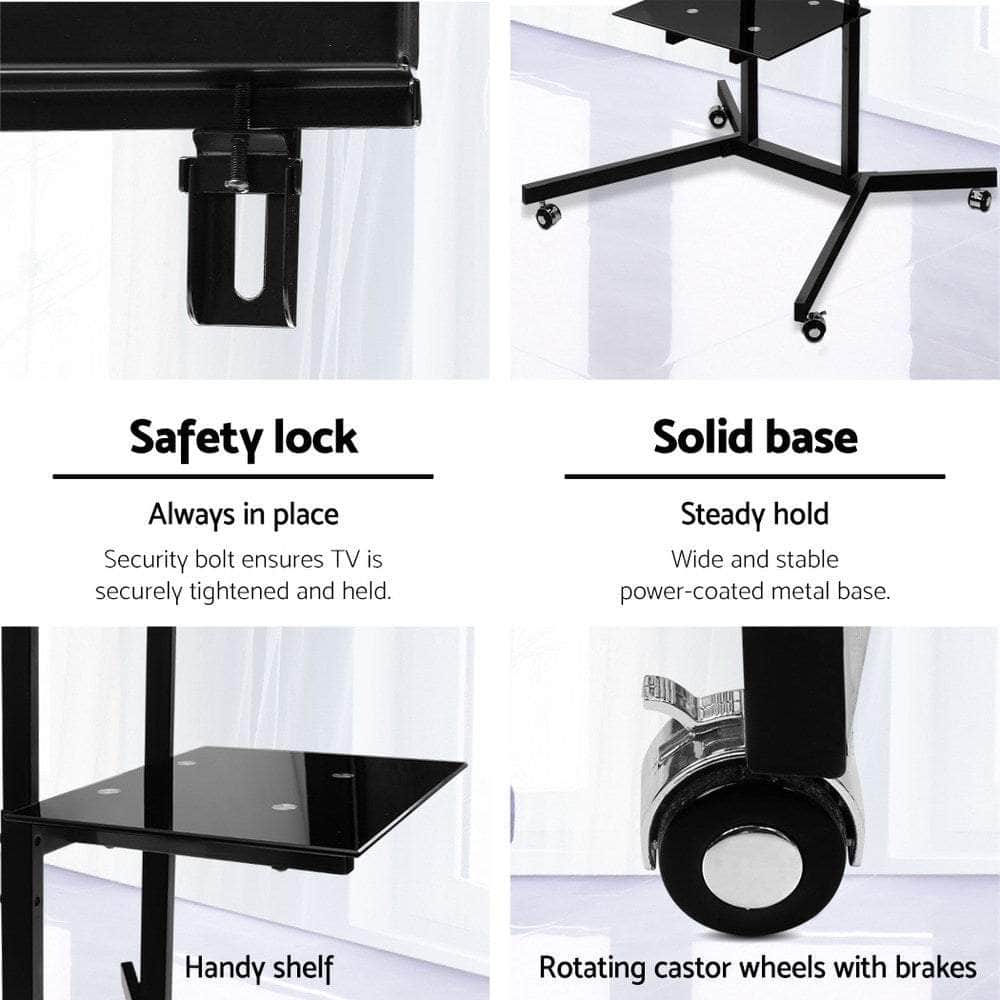 Give your entertainment zone that integrated look with our sleek TV Floor Stand. With a seamless design that incorporates your TV screen with other multi-media equipment into one ensemble, the TV Floor Stand is simply exceptional in every way. The black powder-coated TV Floor Stand can easily hold any TV screen of between 32 inches and 65 inches and comes with flexible mounting for various VESA measurements. Plus, the TV Floor Stand is set on rotating castor wheels with brakes so that you can move it to any room or location as well as any facing. It is also height adjustable of between 129.8cm and 148cm for a comfortable sight line. Not least, the tempered glass top shelf and solid metal base ensures a stable and sturdy structure at all times.