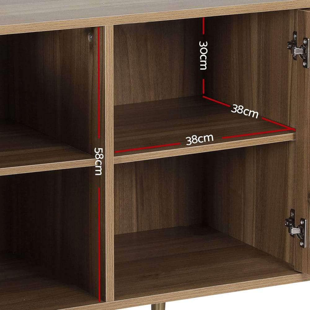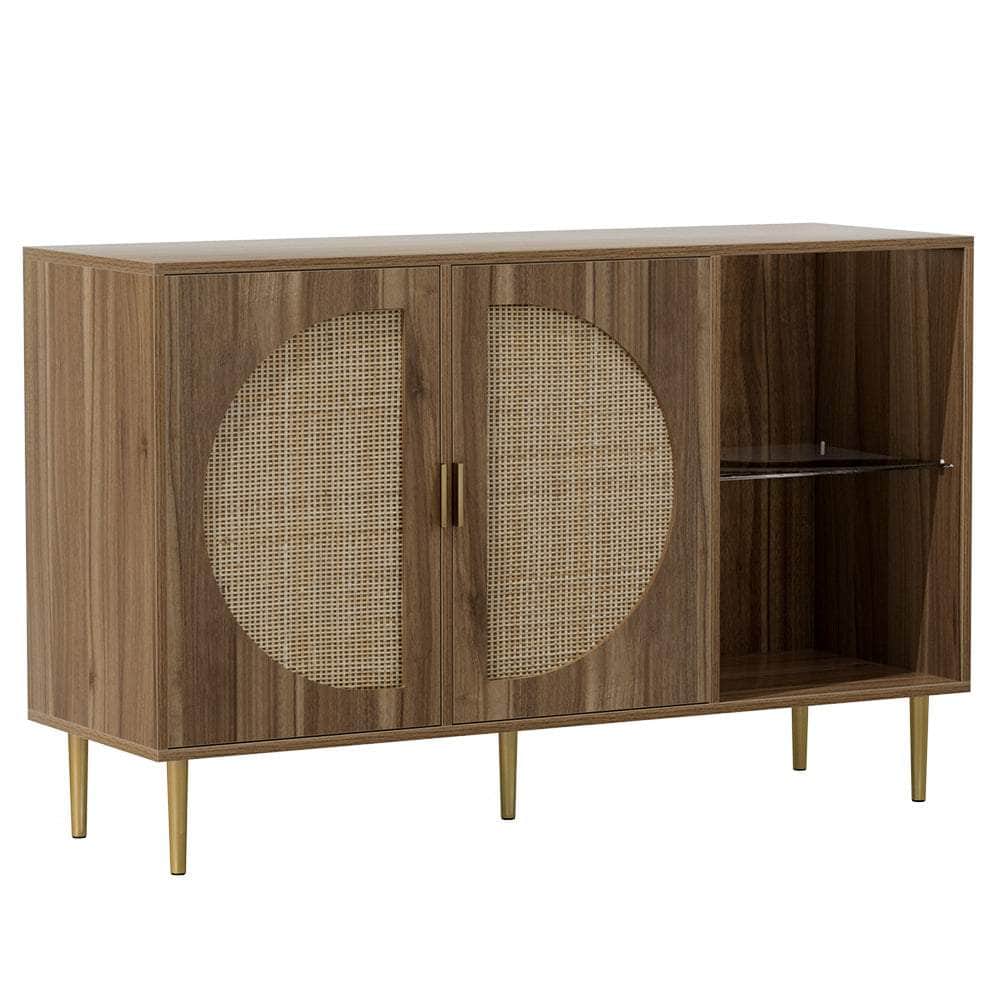 Looking to achieve a coastal bohemian look and feel in a functional furniture piece? Look no further than the Anya Buffet Sideboard. Featuring classic woven rattan doors on an MDF particleboard frame with solid glass shelves, the sideboard is built for long-lasting function. The smooth surface keeps the piece easy to clean and maintain simply wipe away spills with a damp cloth. The piece features a generous two-door cabinet with adjustable inner shelves and a glass display section for your prized pieces. The sleek metal handles allow you to open the magnetic doors and access the generous cupboard with ease. Metal legs with anti-slip foot pads keep the sideboard standing in place and protect your floors. Keep your glassware, crockery and other essentials neat and organized with the stylish and functional Anya Buffet Sideboard from .
