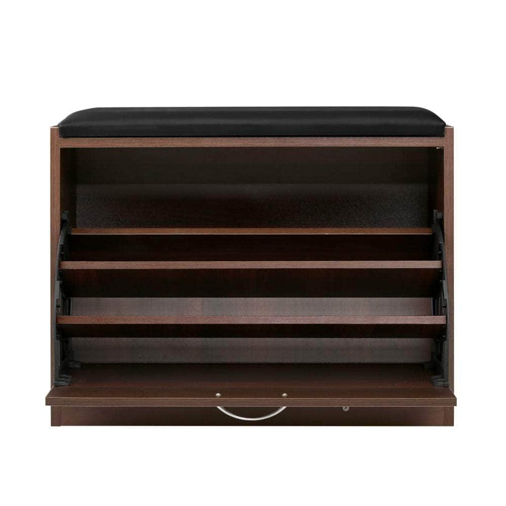 Get yourself a shoe cabinet with an aesthetic difference. Our Shoe Storage Bench adds a touch of luxury and multi-functionality to the ubiquitous shoe cabinet. On first impression, it looks just like a plush PU leather stool. Pull down the front panel and you find three tiers of adjustable shoe shelves with ample space for up to 15 pairs of various footwear (depending on shoe sizes). Made from quality particle board, the bench is sturdy and finished in melamine for durability and easy maintenance. Not least, its thoughtful design means that you can place it in your hallway or entrance for a neat and tidy look that blends seamlessly with your home decor. So remove the clutter and get organised with our shoe storage bench. We are sure it will fit right in with your discerning taste for all things stylish and chic.