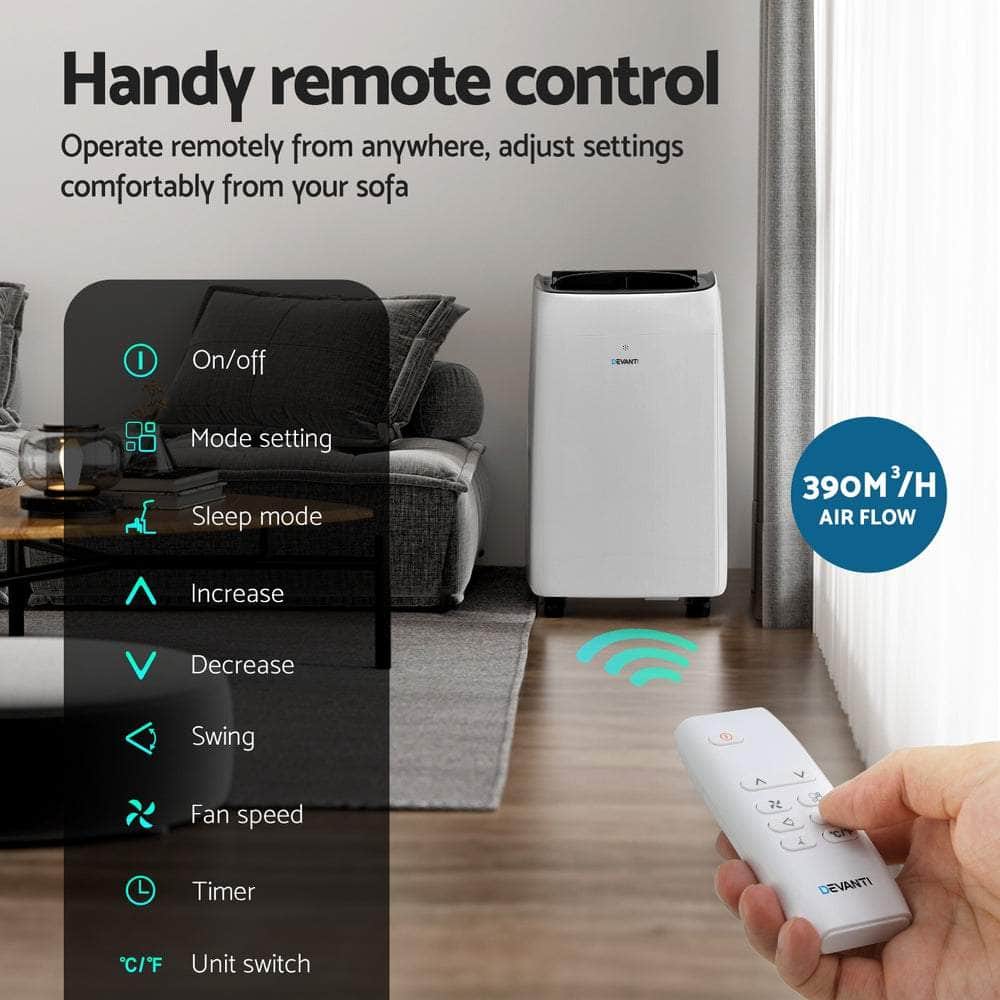 Experience ultimate comfort with our 3-in-1 portable air conditioner. Featuring a smart LCD display, remote control, 24-hour timer, and MIST evaporative technology, it offers efficient cooling, dehumidification, and fan modes. Easy to move and install.