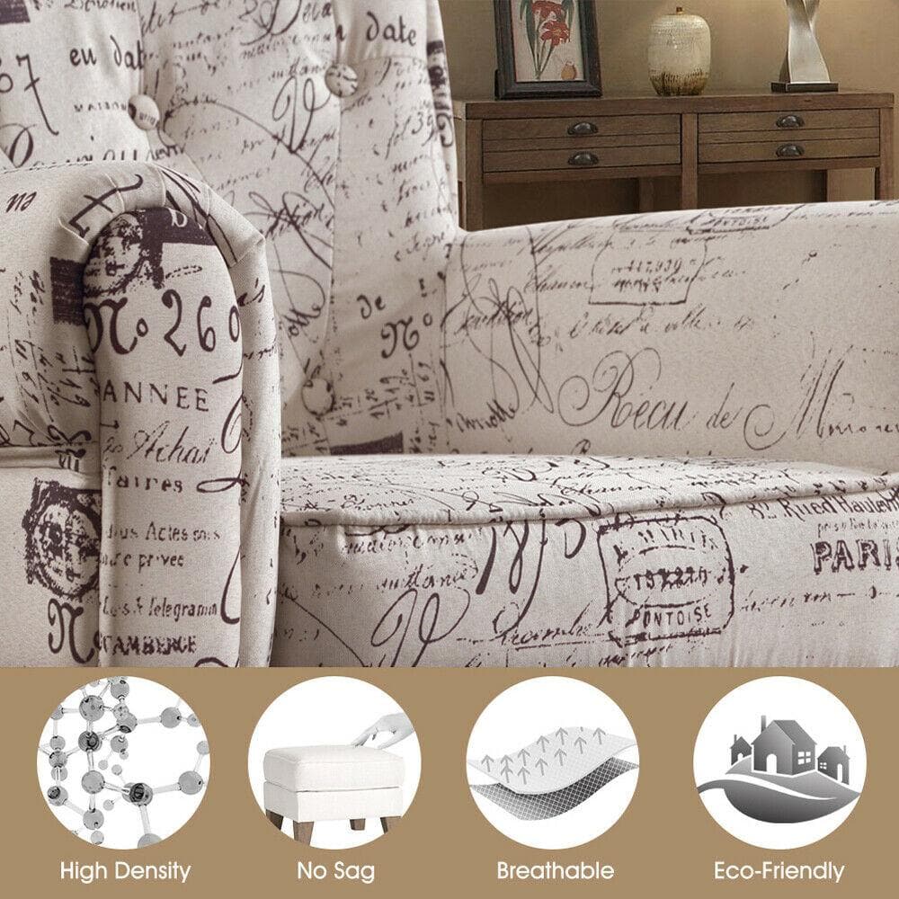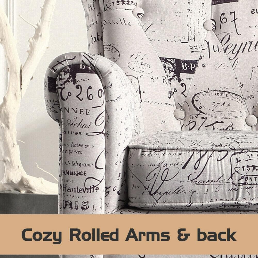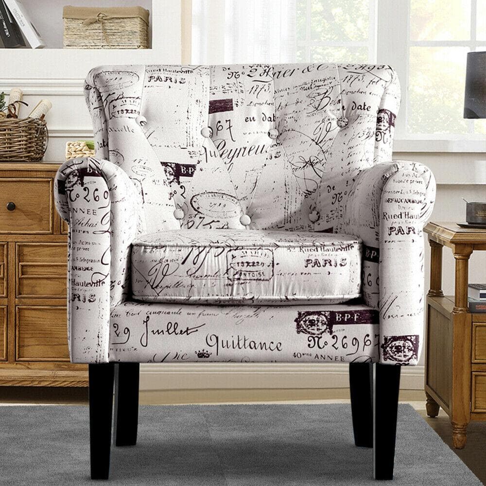 The Upholstered chair is the perfect chair for any room that exhibits an affluent or upscale decor. Aside from the sleek black legs, this chair is upholstered entirely with charming letter in vintage tones. It offers comfortable cushioned seating and the armrests and top portion of the back curve, adding to the exquisite and ed styling of this chair. It is also great as an accent chair to match with your existing furniture in your living room, bedroom, office or den.
