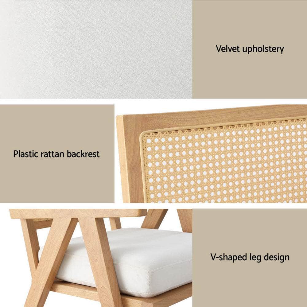 The Armchair features velvet upholstery and a unique plastic rattan backrest. Its rubberwood frame ensures durability, while the extra-thick cushion and high-resilience foam provide comfort. The V-shaped leg design adds a stylish touch, and it's designed for quick and simple setup.