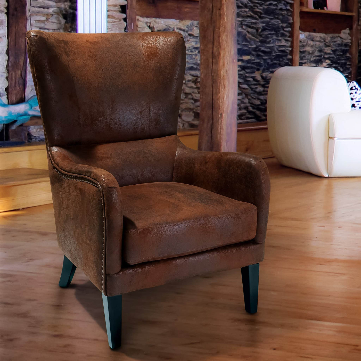 Upholstered in classy aged microfiber the Genoa Rustic Brown microfiber design club chair provides a classic look to your living room bedroom or office. With soft brown aged microfiber upholstery and a well padded seat and back the Salerno will be your favourite arm chair for years to come. It is constructed with strong hardwood for increased durability and has nailhead accents for added flair.