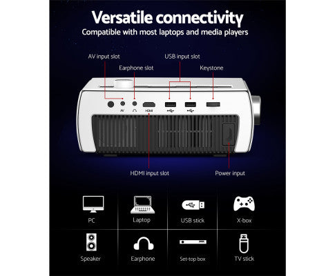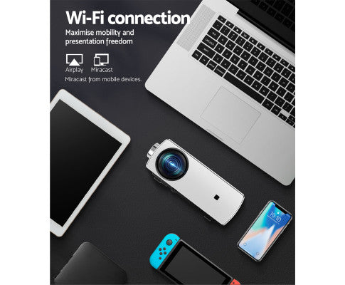 From the small screen to the big screen, now you can enjoy epic entertainment with our Devanti Video Projector. With its ultra-expansive colour gamut, the projector delivers crisp clear images with more brilliant colours to give you the best projection experience. The projector is compatible up to 1080p, so you won’t have to compromise on quality. Using Wi-Fi connectivity, our video projector effortlessly supports screen casting from your iPhone, iPad, smartphone, tablet or laptop, so you can stream content cable free. It also features a built-in heavy bass speaker and a high-lumens lamp with a lifespan of up to 30,000 hours. For even more entertainment value, the projector includes HDMI, USB, AV, Micro USB and 3.5mm audio ports for fast connection to multiple devices such as external speakers, game consoles and hard disks. Get the home cinema experience and order today! Include remote control and additional AV audio cable and adaptor.