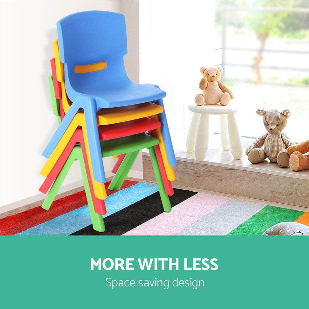 Use the chairs either indoors or outdoors and the weather will not disturb it one bit. The rust-resistant paint is suited for use under the elements for the whole gamut of child focused activities. And with their richly coloured primary hues, the Chairs are an instant draw for any enthused child with an eye for brilliant fun. And when all the playing is done, just stack the chairs up for easy storage.