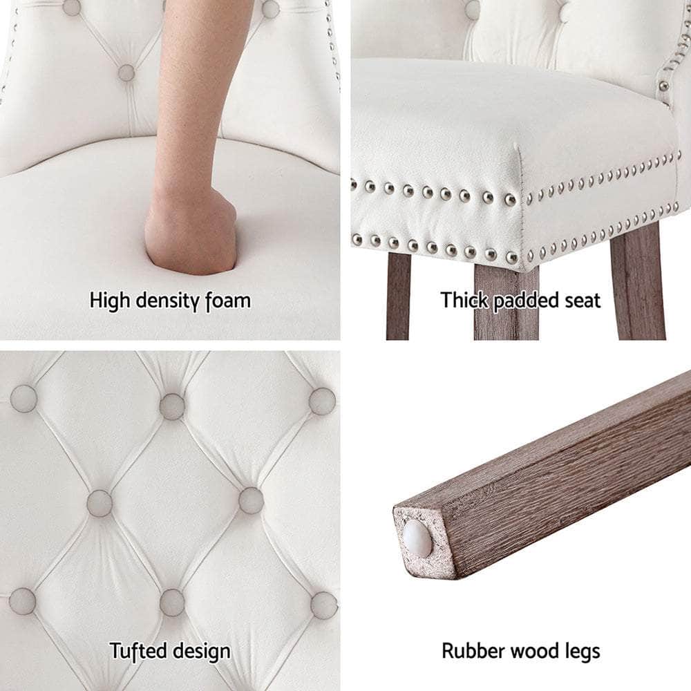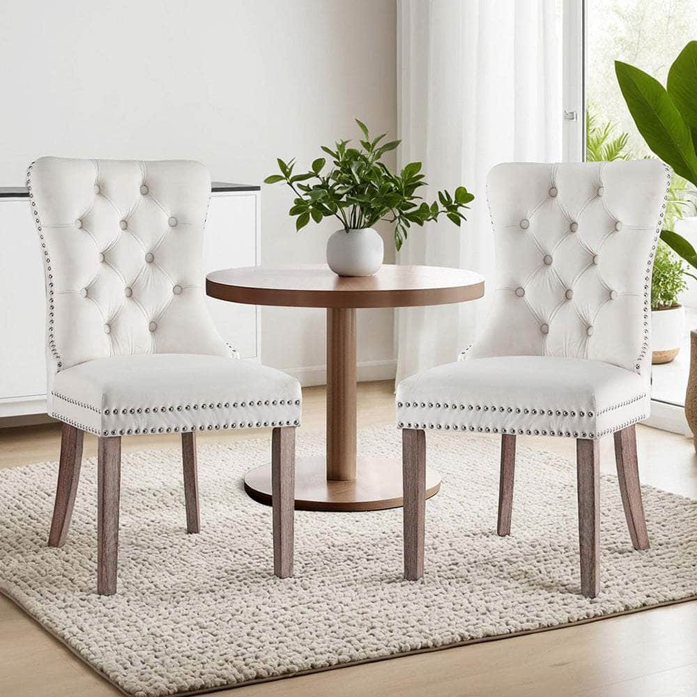 Elevate your dining space with this set of 2 Dining Chairs, designed to bring timeless charm to your home. Upholstered in your choice of PU leather or plush velvet, the chairs feature a button-tufted backrest and rivet edging for a sophisticated look. Crafted with a cushioned backrest filled with high-resilience foam, these chairs provide exceptional comfort during meals and gatherings. The rubberwood legs ensure reliable support, while anti-slip feet protect your floors. Perfectly blending style and practicality, these dining chairs make a stunning addition to any dining room.