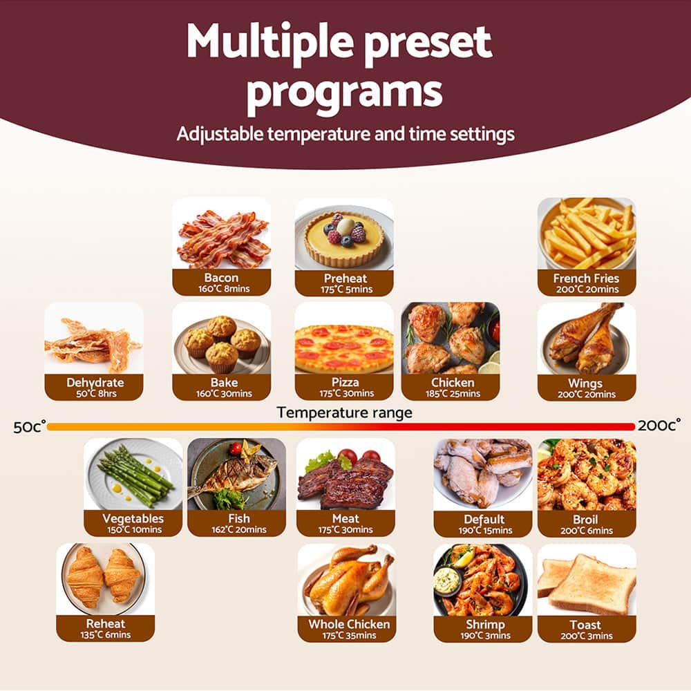 Cook smarter with the 13L Air Fryer Oven. With a large touch display and 17 pre-set programs, it makes cooking fast and easy. Enjoy crispy results with 360�� hot air circulation and adjust temperatures from 50��C to 200��C. Features include a 90-minute timer, basket shake reminder, touch controls, and dishwasher-safe parts. Comes with a free non-stick crisping tray and is SAA approved.