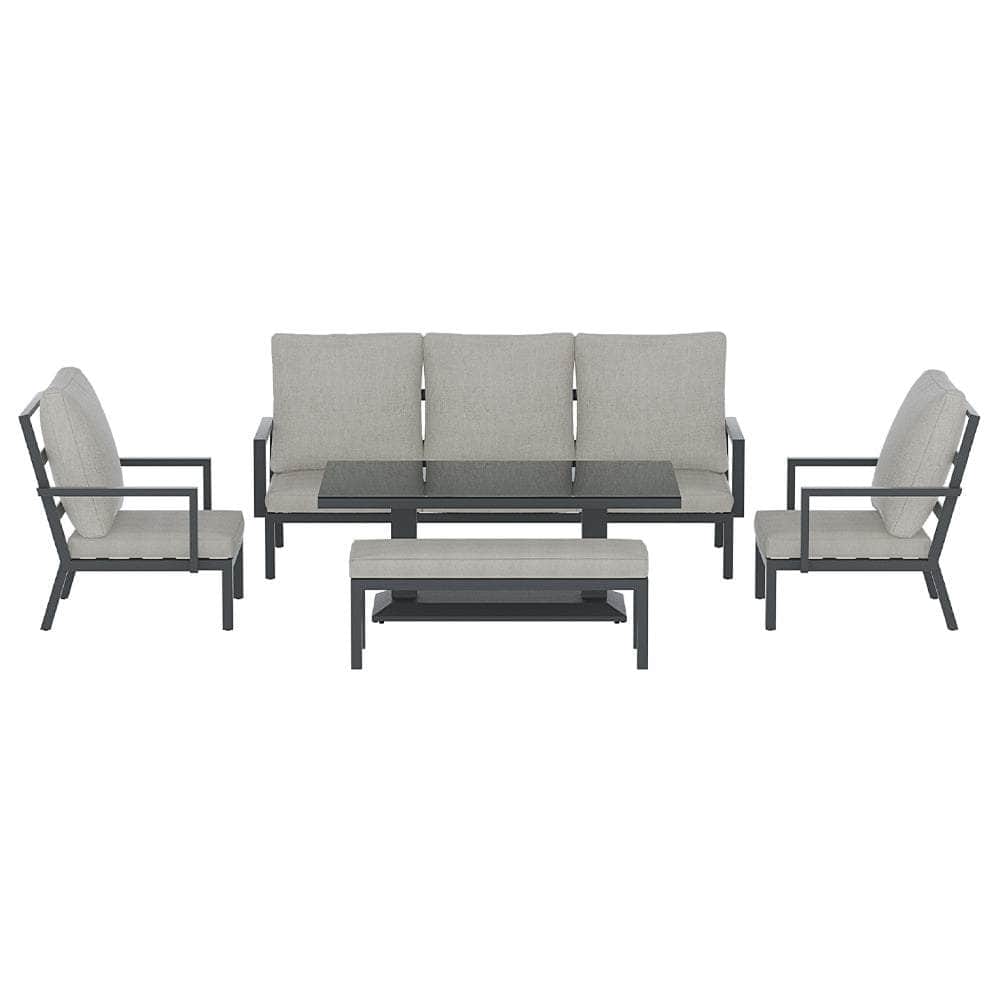 Bring friends and family together with the new 7-seater Lounge Set from. With one 3-seater sofa, a 2-seater bench and two single sofas, there's plenty of room for everyone at the table. Made with a powder-coated aluminium frame and topped with 10cm thick cushions, the set is strong and durable-perfect for withstanding outdoor weather. The cushion covers are UV and water-resistant, and they can be removed for easy cleaning. The stylish aluminium rising table features a 5mm thick tempered glass tabletop so you can easily switch from lounging to dining. The contemporary design is perfect for backyards of all kinds, making it the ideal dining set for all your outdoor entertainment needs.