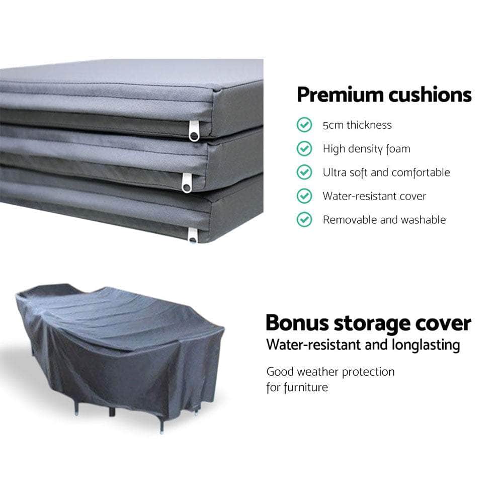Dine in exquisite style with our elegant Outdoor Dining Set. Finished in UV-resistant PE rattan with a strong and sturdy aluminium frame construction for both chairs and table, this multi-piece dining set is designed to please as well as stand up to the weather elements. The chairs have a sleek and contoured profile with 5cm thick high density foam cushions to ensure comfort and style are always in place. And the spacious dining table features a 5mm thick tempered glass top for safe and hardy use. Not least, a water-resistant cover for the entire ensemble is also included to keep it clean always.