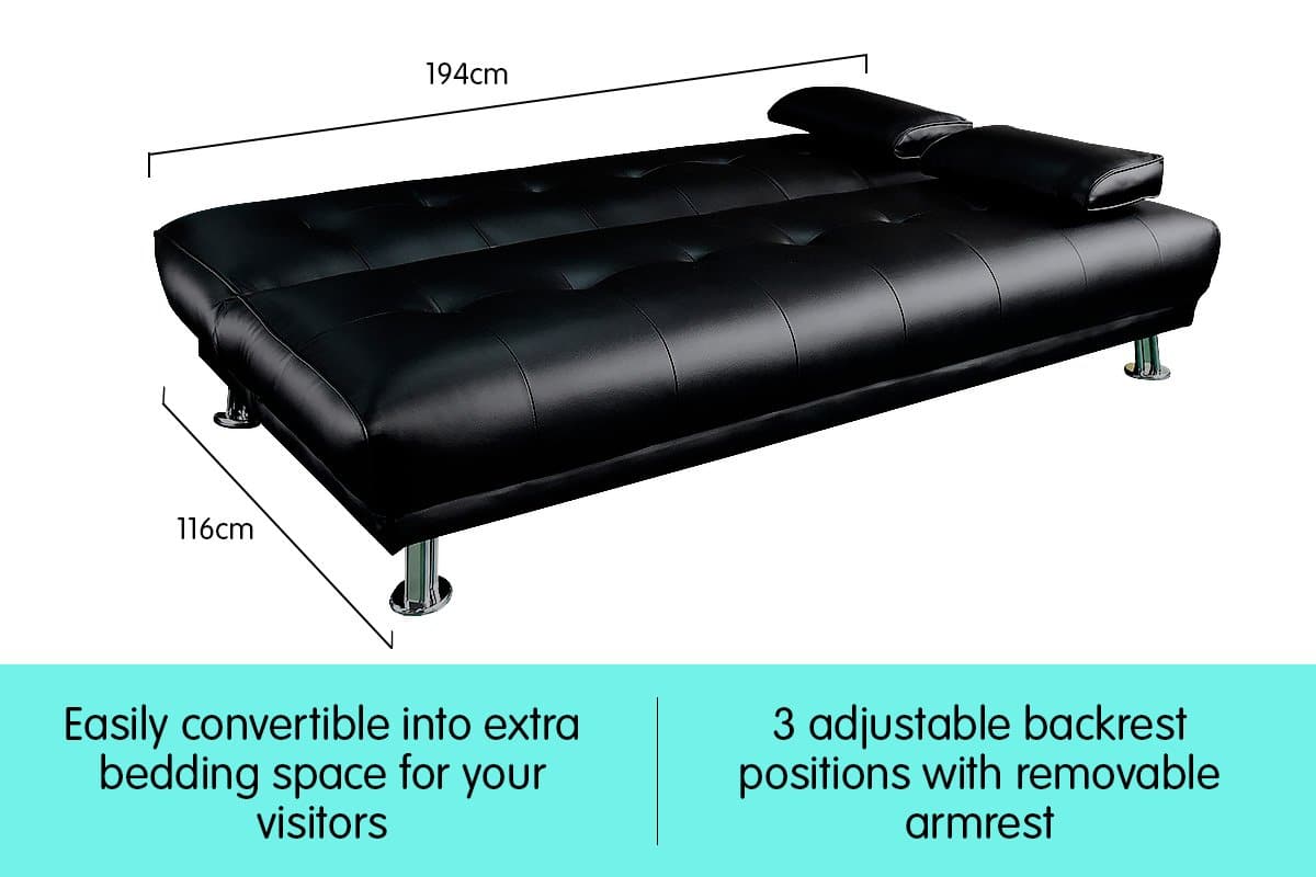 3 Seater Faux Leather Sofa Bed Couch Lounge Futon - Black