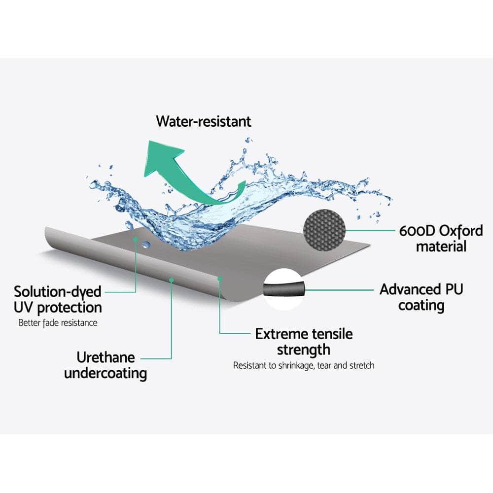The Cover is made of 600D polyester with PU coating for effective waterproofing as well as UV and mildew resistance. It also features elastic hems for easy fitting and double-stitched seams for added strength.