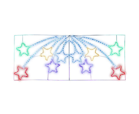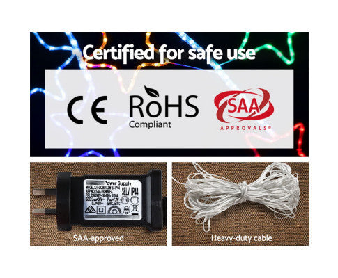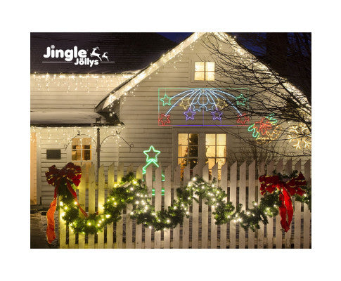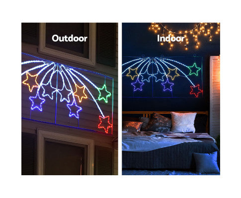 Bring the brilliance of Christmas to your home with our mesmerising Jingle Jollys LED Falling Star Light. The brilliant motif light depicts ten five-pointed stars falling from a central point. The multicoloured 31V LED bulbs that are set in a sturdy metal frame, consume little energy and remain cool to the touch. Hang the light up indoors in your living room, or outdoors in your garden for all your neighbours to appreciate. And you do not need to take the light down as soon as Christmas is over. It is waterproof and weather-resistant, so you can leave it out well into the New Year. Create a lively and bright Christmas ambience throughout the season.Counting down to Christmas! Get yours early to avoid busy logistics when approaching Christmas!