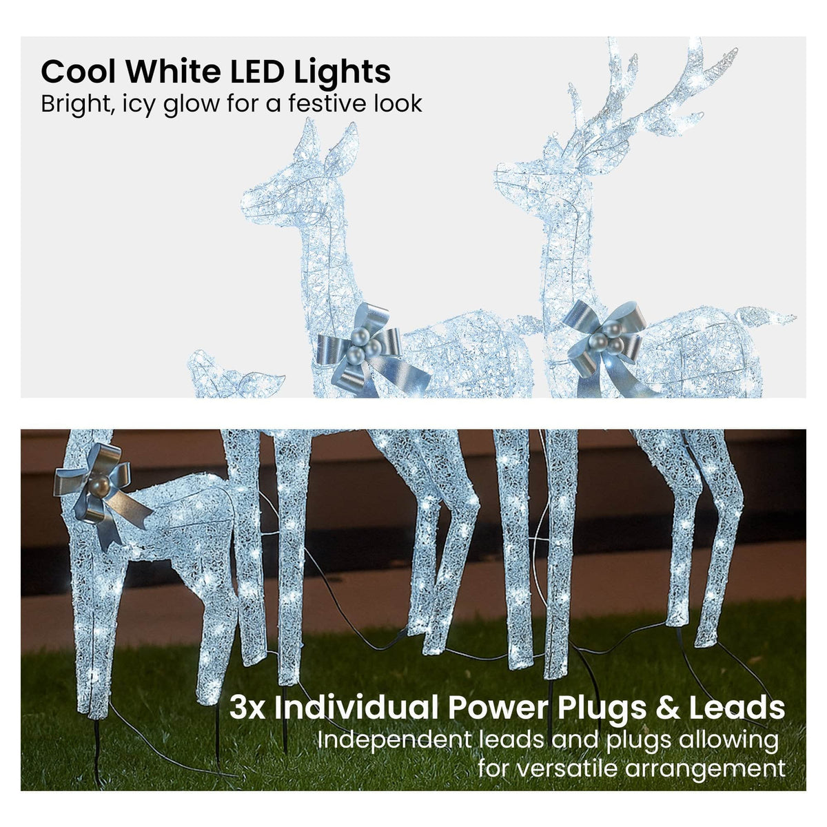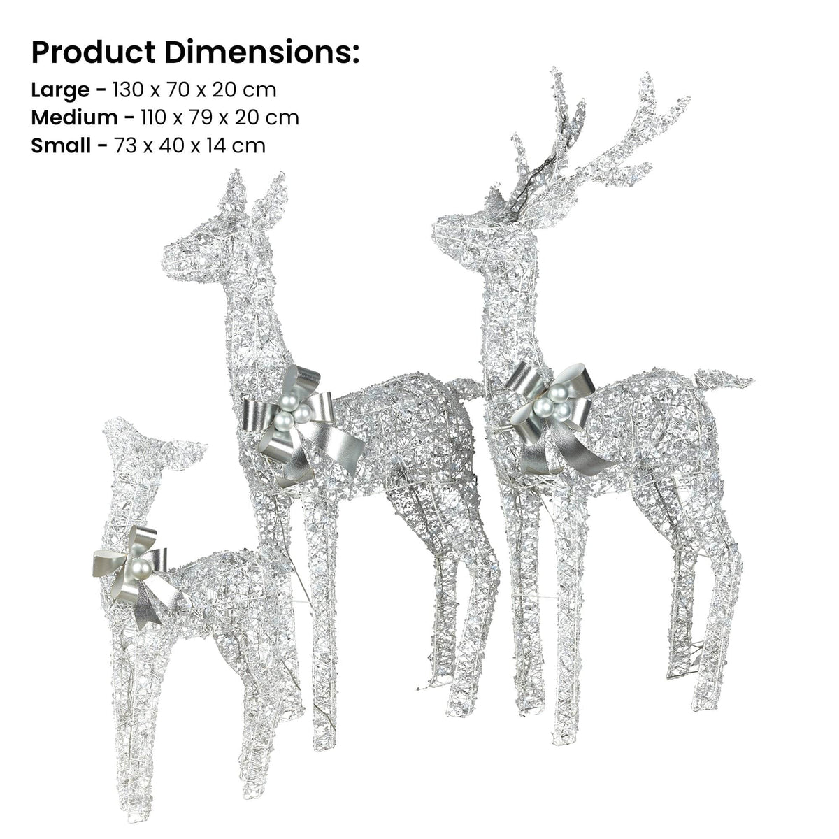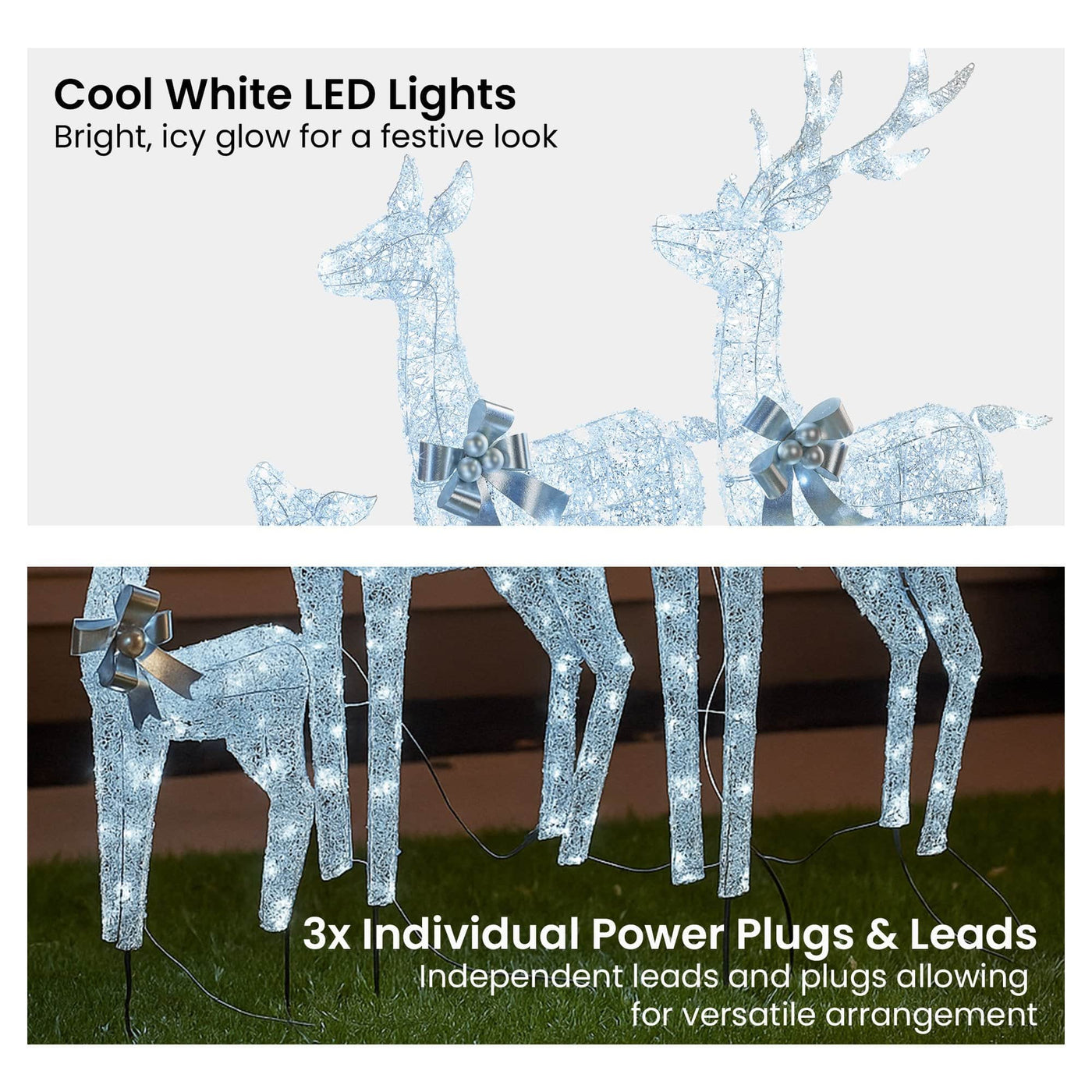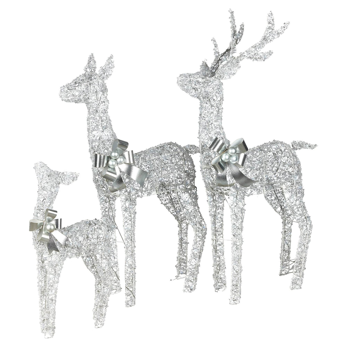 Let your outdoor decor sparkle with a graceful trio that is made to shine. This set of three reindeer is covered in shimmering acrylic beads and finished with elegant silver bows for a festive, frosty look. Each one glows with cool white LED lights and features its own power lead for flexible display options. With sturdy wire frames that can be staked to the ground, they are built to dazzle your yard all season long.