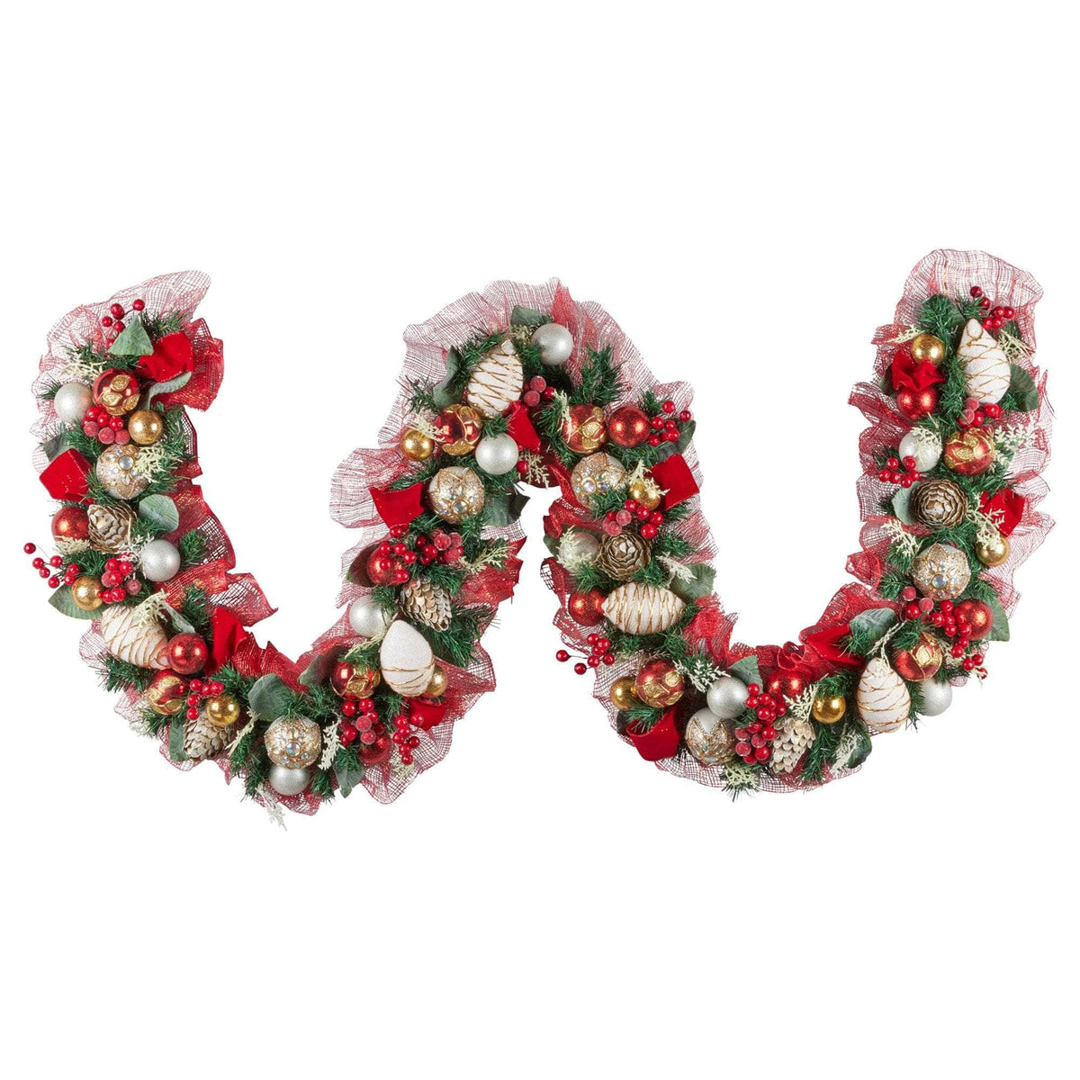 Featuring realistic foliage and a charming Sinamay backing, this beautiful floral garland infuses your home with festive cheer. Decorated with baubles, berries and ribbons in traditional Christmas colours, this garland is simple to assemble and brings a timeless touch of elegance to your seasonal holiday.