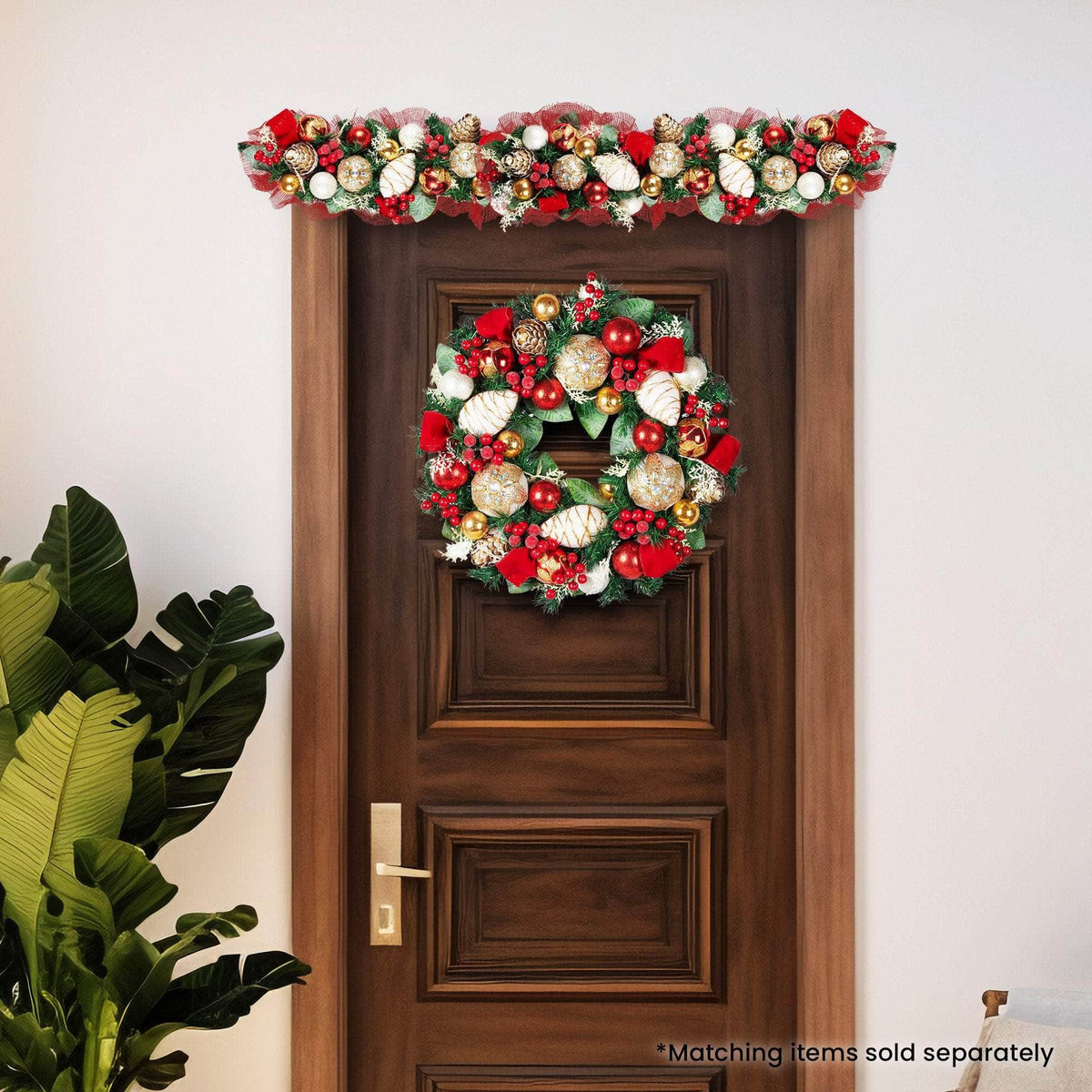 Complete your holiday decorations with our stunning Christmas wreath, the perfect final touch to your holiday decor. Featuring lifelike foliage and decorated with ornaments, berries and ribbons, this wreath embodies the essence of classic Christmas colours. Ideal for doors, windows or walls, it adds festive elegance and creates a cosy, welcoming ambience in your home.