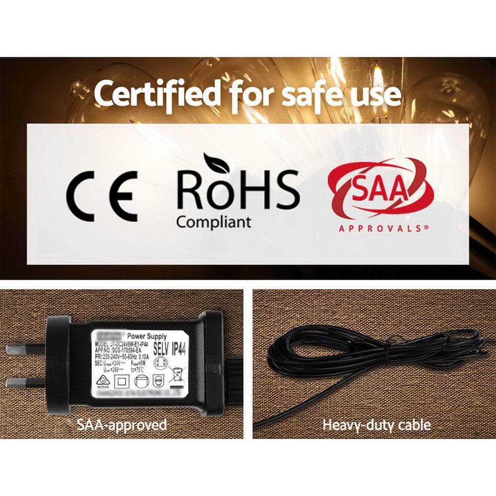 Introducing the Jingle Jollys Festoon String Lights - the perfect addition to any occasion! Whether it's a wedding, birthday party, or any special event, these lights are sure to create a warm and inviting atmosphere with their bright and mellow glow. Not only are they great for indoor use, but they're also suitable for outdoor use, thanks to their IP44 rating, which means they can withstand all weather conditions, including rain.