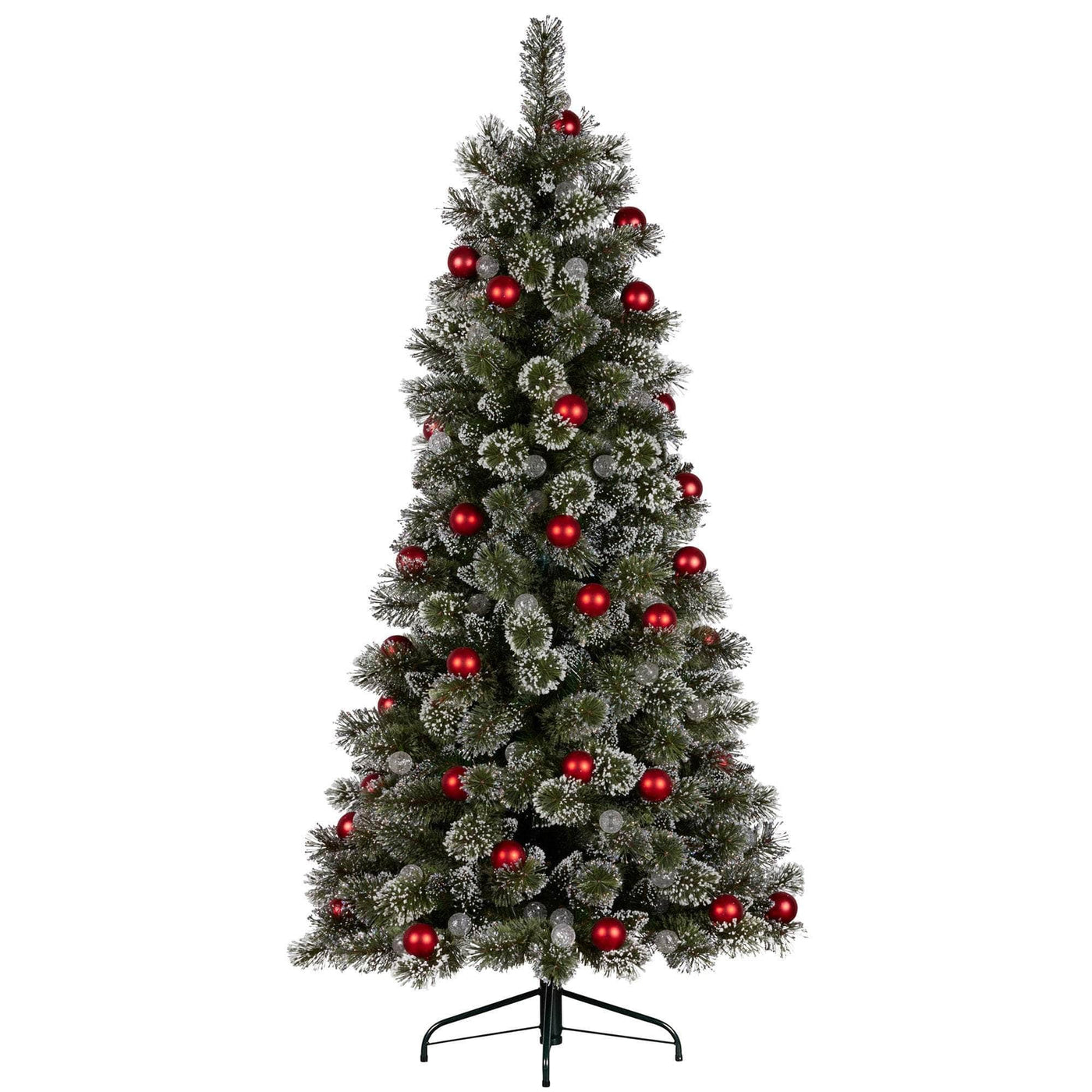 This slim Snowy Bristle Christmas tree is ideal for smaller nooks and crannies. Its a slimmer build than our regular Snowy Bristle model but still keeps its lovely charm. Decked out with frosty snow bristle tips and adorned with bright red baubles, this tree is guaranteed to bring that festive cheer. Plus, the LED snowball lights come with 11 cool light settings, from colourful to warm white and everything in between, setting the perfect holiday mood. And at 7.5ft (229cm) tall, this tree is sure to impress in any home or office!