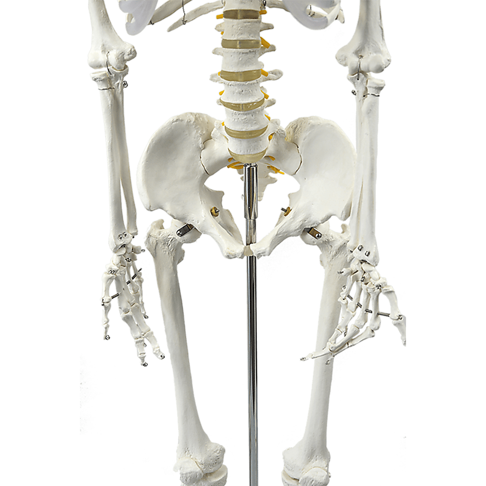 Uses for the adult life-sized skeleton are wide-ranging. According to need, it can be painted on, dressed in clothing and even drilled through. The life-like skeleton features visible nerve branches, a herniated lumbar disc and the vertebral artery.
