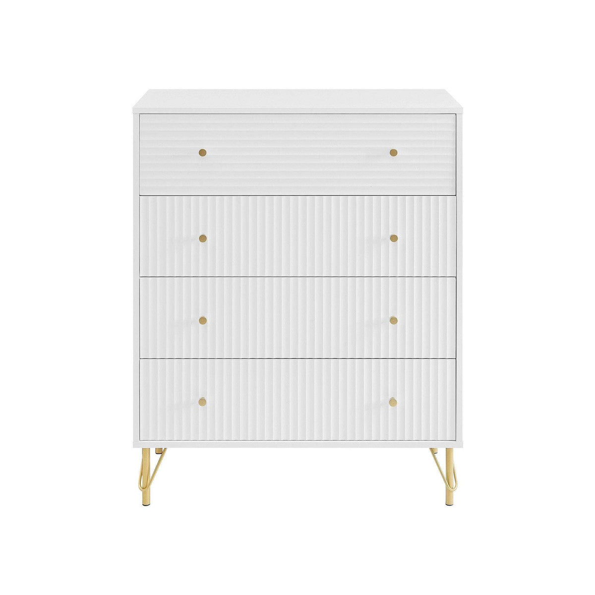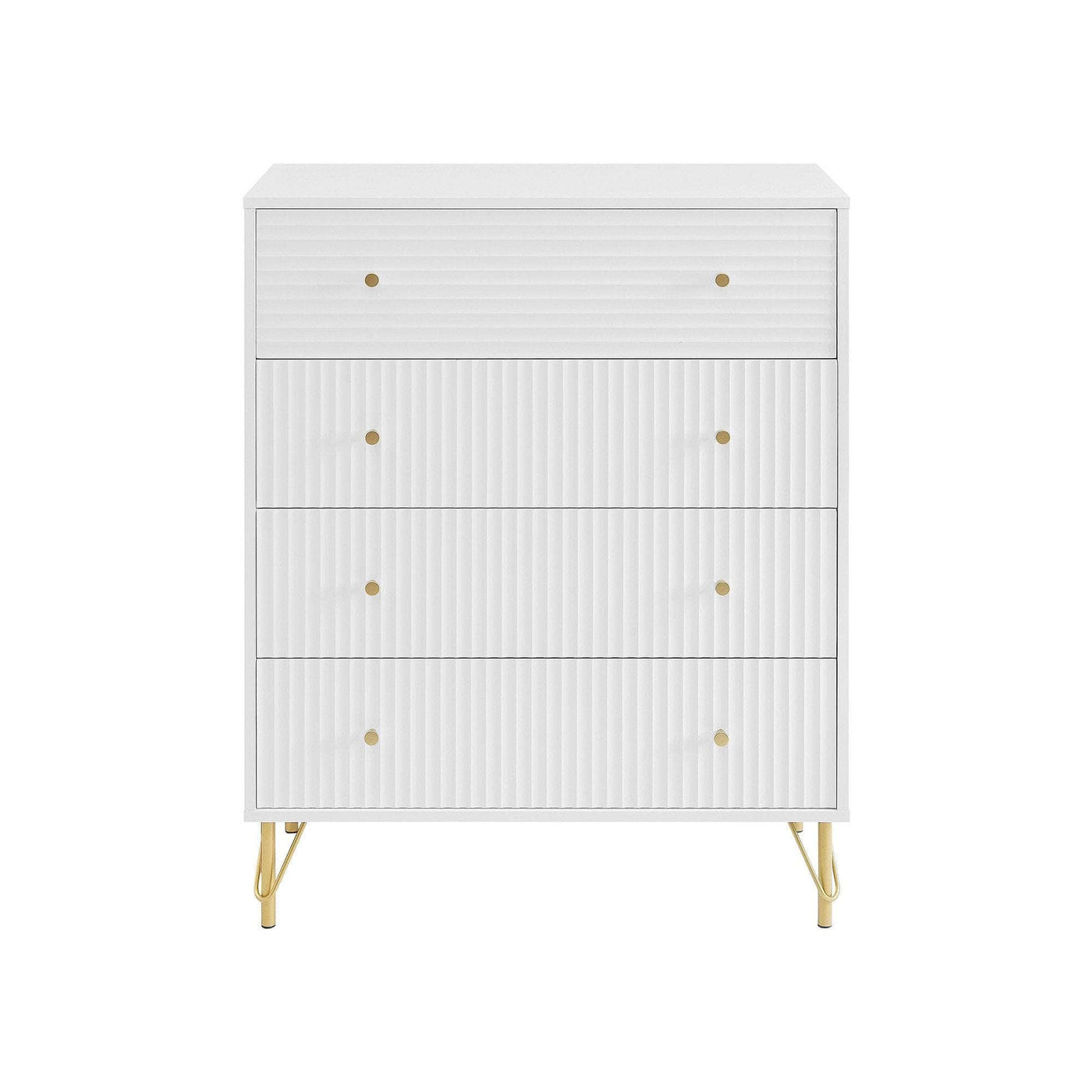 Revitalise your living space with this exquisite chest of drawers from Sarantino. The bold statement is set by its wavy fluted design, and the gold drawer handles add an elegant yet subtle contrast to this pieces overall aesthetic. Its contemporary charm is accentuated by the metal base and golden legs, promising a fusion of style and durability. The ample drawers ensure seamless storage for your essentials. Elevate your interior with the allure of this captivating drawer chest, redefining your space with a blend of form and function.