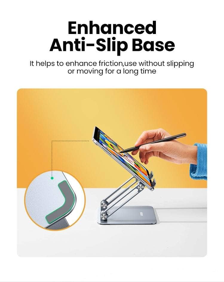 The folding laptop stand is made of premium aluminum alloy, with smooth edges, which protects your device from scratches. Provide a highly sturdy and durable silicone pad to ensure a close connection with the desktop to fix your laptop in place without worrying about shaking and slipping