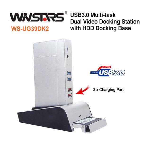 WS-UG39DK2 Multi-task Dual Video Docking Station enables you can easily expand your desktop and make your laptop more mobile. It lets you connect up to 2 additional monitors and all of your devices into one central location. When you need to be on the go, easily disconnect with one simple connection.