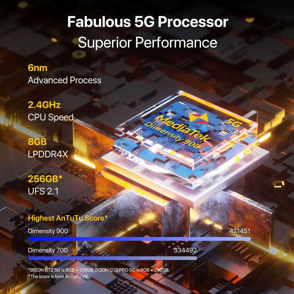 * BISON GT2 5G is 8GB +128GB, BISON GT2 PRO 5G is 8GB+256GB.