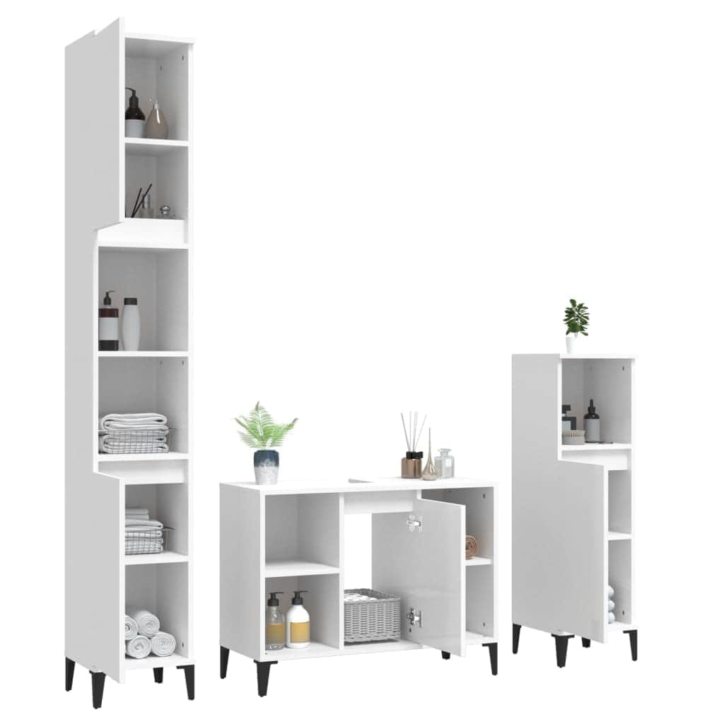 This stylish bathroom furniture set, featuring spacious storage space, is an excellent addition to your bathroom, giving it a tidy and striking appearance! Durable material: The engineered wood is of exceptional quality with a smooth surface and features strength, stability and resistance to moisture.Ample storage space: These bathroom cabinets offer ample storage space for keeping your bathroom supplies well organised.Metal feet: The metal feet add a modern and calm style to your interior while ensuring stability.Easy-to-clean surface: The bathroom unit is easy to clean with a damp cloth.Stylish design: The clean lines and sleek design blend into your bathroom perfectly. Warning:To prevent it being overturned, this product must be used with the provided wall attachment device. Good to know:Screws and plugs for inside the wall are not included. We advise to find and use screws and plugs suitable specifically for your walls. If you're not sure, you can consult with a professional. Please read and follow each step of the instructions.