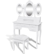 This charming dressing table and stool set is made of high-quality wood. Its Victorian style and clean white finish will add a touch of elegance and beauty to your boudoir or changing room. The exquisite workmanship is another characteristic of this table and stool set. The mirrors have a freestanding frame, and you can turn the 2 side mirrors to a desired angle. Surprisingly, the mirror frame and the table can be used separately. Five ornate drawers offer you additional space for your ornaments, cosmetics and other belongings. This dressing table and stool set will be a focal point in any room. It will be quite easy to assemble as mounting accessories are included in delivery.