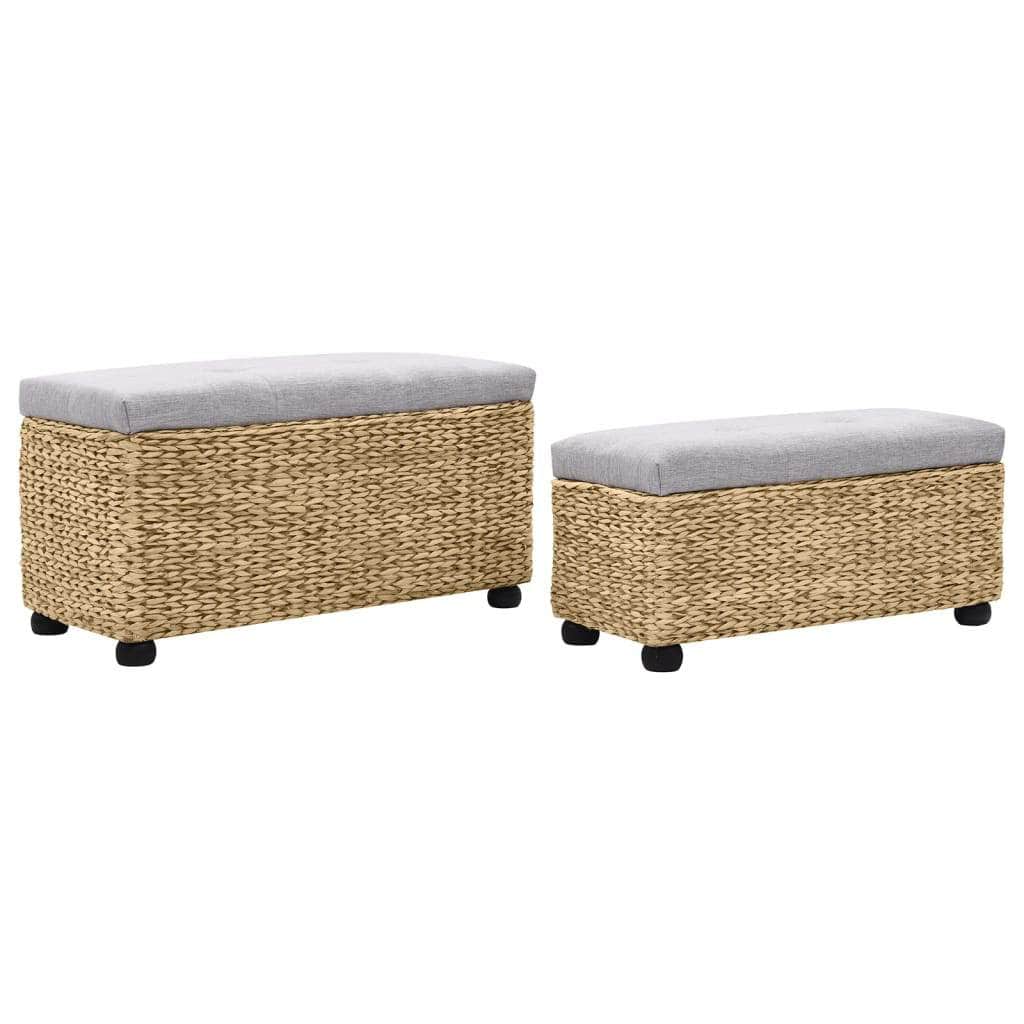 The bench set will make a timeless addition to your home decor. Made of seagrass, the benches will add a rustic and natural charm to your room. The set provides ample storage space for keeping various items within reach and neatly organised. The cushions add to the set's seating comfort. The wooden feet make the set more stable and durable. The benches are easy to assemble. Delivery includes 2 benches in different sizes.