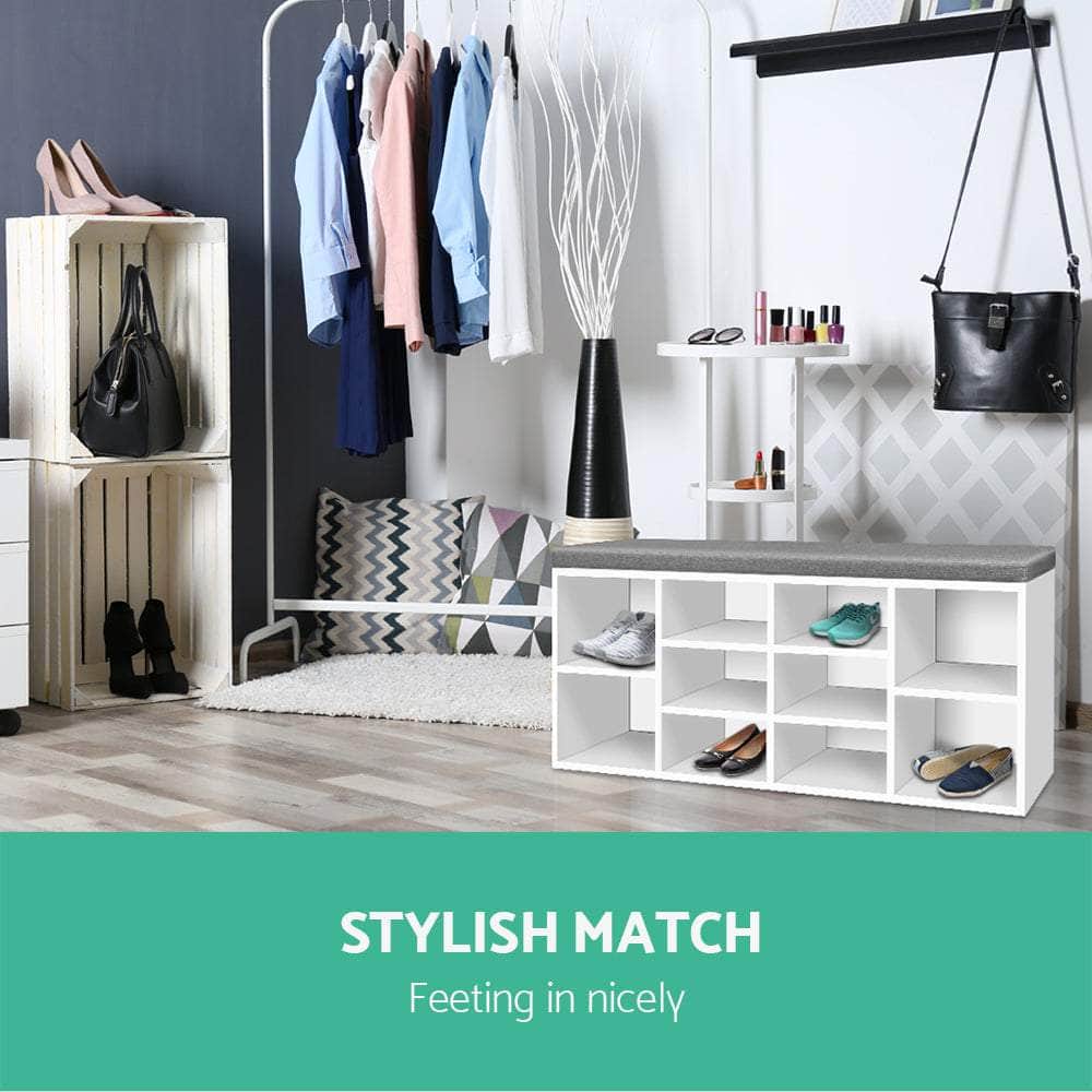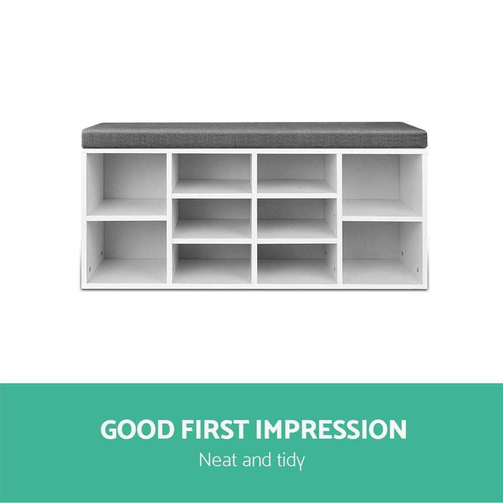 Practical and stylish. Our Shoe Shelf Bench blends two functions into one elegant piece. The shoe shelf features 10 compartments to fit up to 10 pairs of footwear of various shapes and sizes while the fabric bench offers a soft and comfortable rest with its 4cm thick detachable cushioned seat. The entire ensemble is made from particle board for strength and durability. Not least, the two-tone design adds an exquisite touch to this very pragmatic ensemble.
