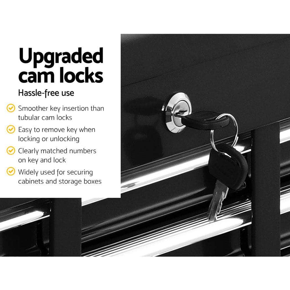 This robust, multi-drawer Tool Trolley is an essential for any workshop. Crafted from durable steel, it features smooth ball-bearing slides for easy access and a secure lock system for safety. Its spacious design includes varying drawer sizes to accommodate tools of all shapes, complete with non-slip liners. The chest is also mounted on omni-directional castors with locakble front wheels, ensuring a smooth maneuverability and stable positioning. Sleek and functional, it's perfect for organizing and protecting your valuable tools.