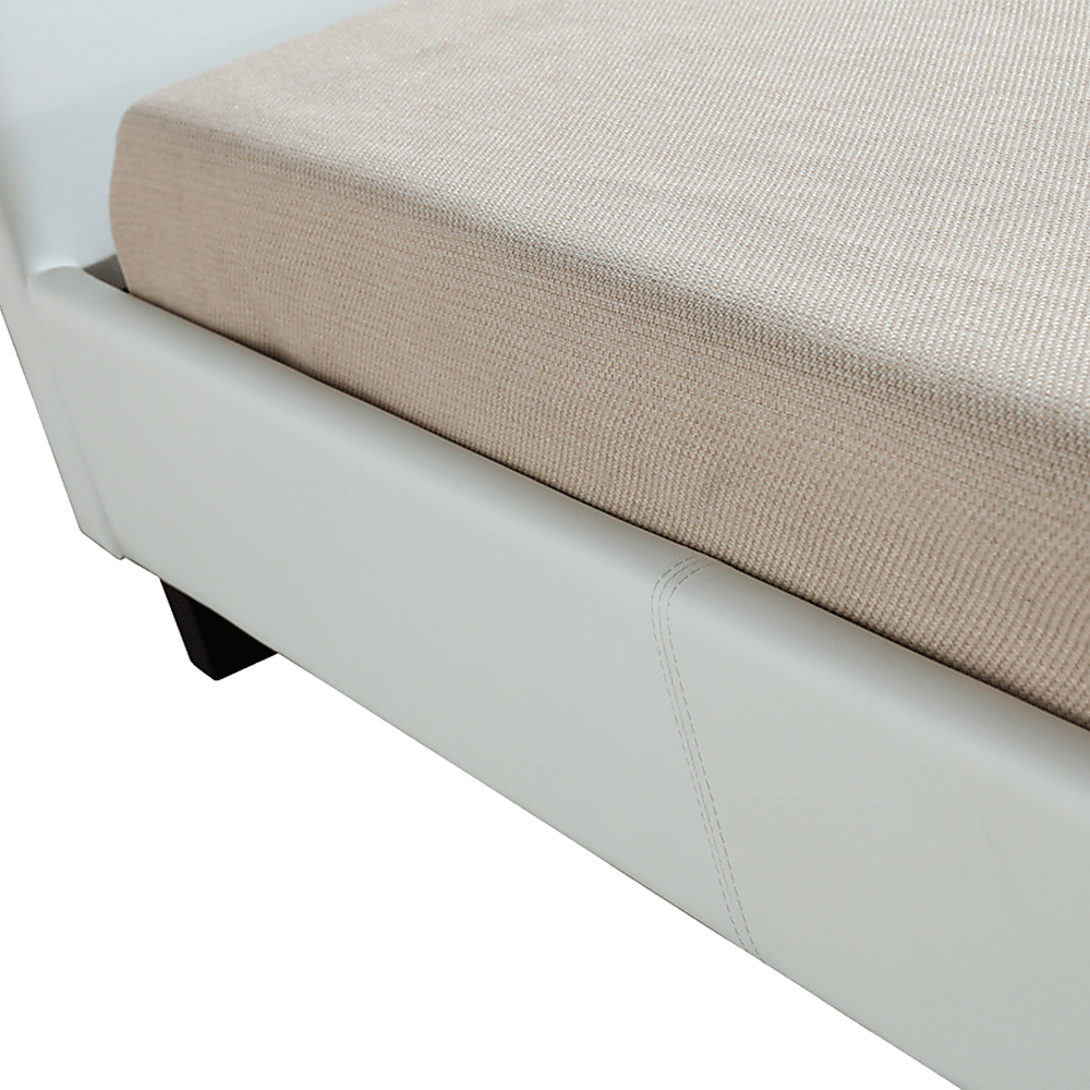 This bed from the expert craftspeople at Palermo measures 115 cm wide by 206 cm long, with a headboard that measures 88 cm tall (10cm leg & 78cm headboard) from top to bottom. It fits a king single mattress measuring 106 x 203 cm. The frame and headboard feature a durable PU Leather covering that's easy to clean and that will look great for many years to come. The headboard is padded for comfort while sitting up and reading or watching TV. An attractive stitched-together look and clean, simple lines make this bed frame a perfect complement to the modern bedroom. And the white colour adds visual appeal without being ostentatious.