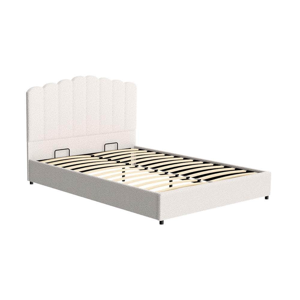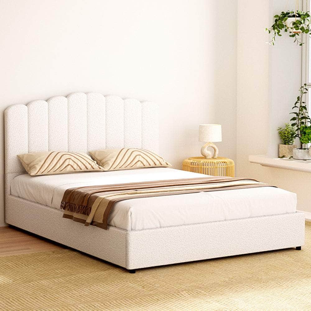 Introducing our elegant bed frame: upholstered in boucle fabric, featuring a gas lift storage mechanism, wooden frame with slat support, padded headboard, smooth edge finish, and sturdy metal connectors for a blend of style and functionality in your bedroom.