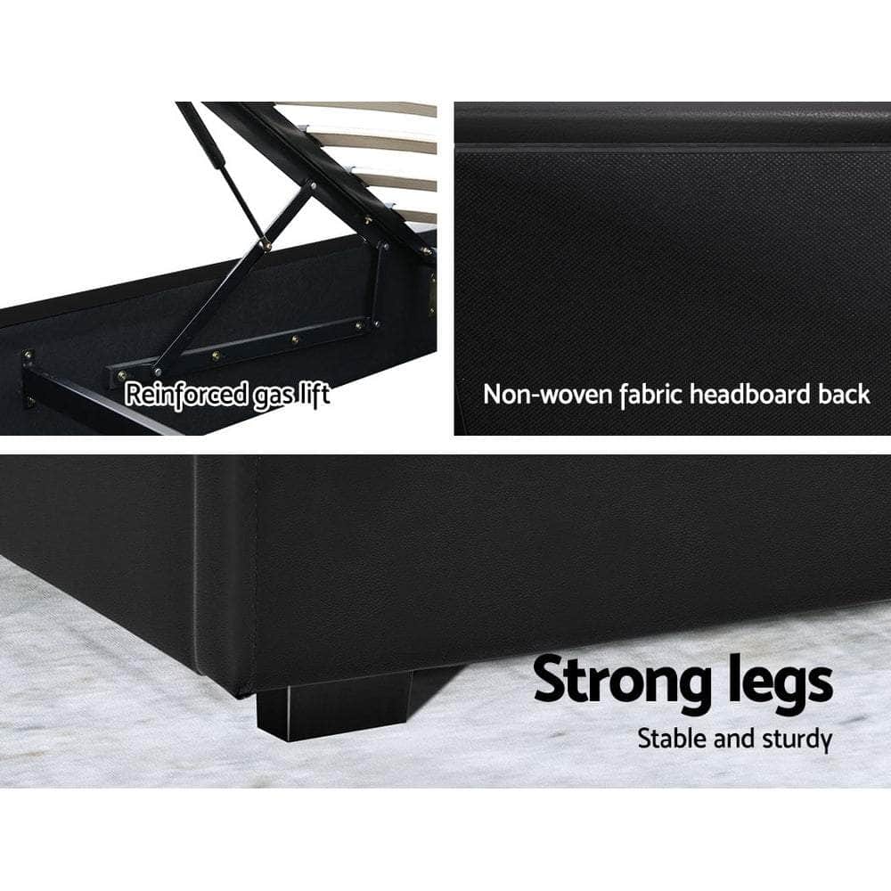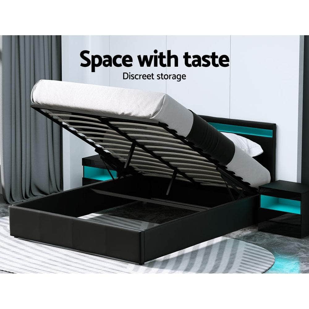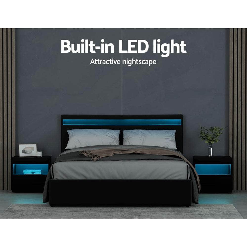 When is a bed more than a bed? When it uses our Cole Gas Lift Bed Frame. On the outside, this bed frame looks like just any other quality bed frame. Beautifully padded with generous foam and covered in PVC leather. Strong steel frame with high grade steel centre rails, heavy-duty bars and arched slat base. Large and comfortable headboard. But with one easy gas lift of the bed base, the bed frame becomes an instant storage area with acres of space for your bedding essentials. Simply store your extra pillows, bed sheets, cushions and more in the storage compartment and hide them away for the season. Even better, you no longer have to fumble in the dark for a light switch in the middle of the night with this bed frame. It comes with built-in LED lighting that can be customised into 16 different colours and 4 flashing modes to suit your preference. Not only will the illuminated bed frame create a beautiful ambience, it will also save you from buying extra bedside lamps or nightlights. So do not just get any bed frame, get this 3-in-1 bed frame to expand your home storage capacity and light up your nights with just a lift of your hands.