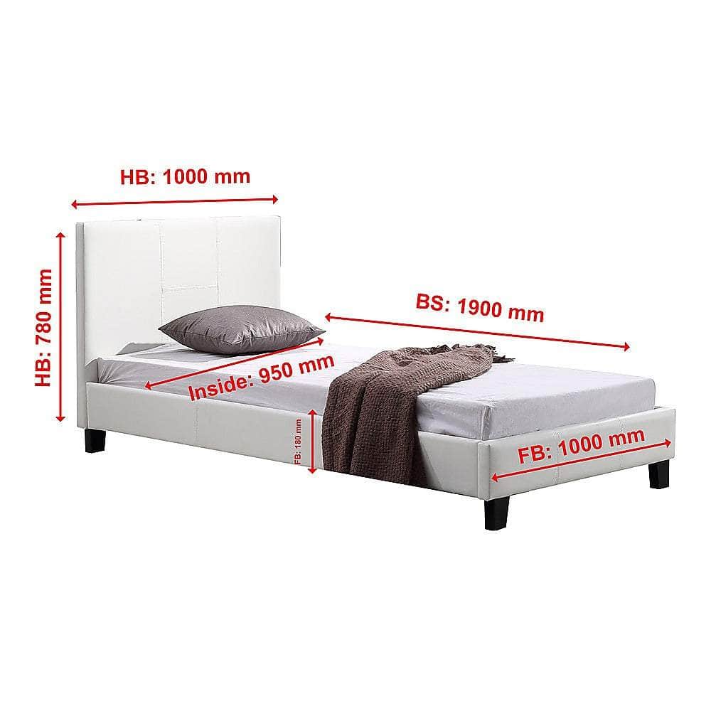 This bed from the expert craftspeople at measures 100 cm wide by 190 cm long, with a headboard that measures 88 cm tall (10cm leg 78cm headboard) from top to bottom. It fits a single mattress measuring 92 x 187 cm. The frame and headboard feature a durable PU Leather covering that's easy to clean and that will look great for many years to come. The headboard is padded for comfort while sitting up and reading or watching TV. An attractive stitched-together look and clean, simple lines make this bed frame a perfect complement to the modern bedroom. And the white colour adds visual appeal without being ostentatious.