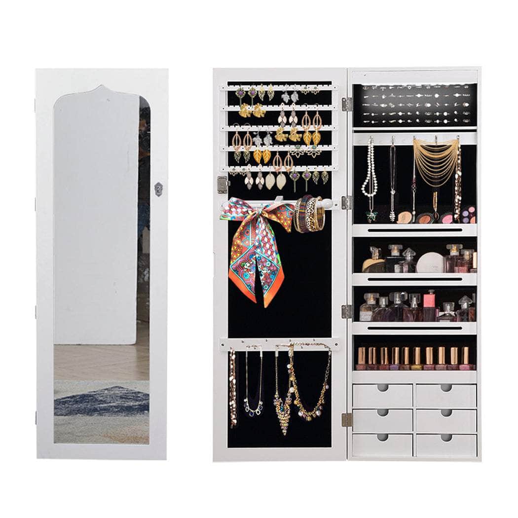 It's not only a full-length mirror, but also a Jewellery Cabinet. It's a true reflection of beauty! It can be wall mounted if space is limited. And it can also hang on the door. The classic design works well with any style of bedroom. Open it and it's a beauty wonderland. You'll find ample storage space for your jewellery pieces with slots for earrings and rings, hooks for necklaces, rod for scarf, pouches for cosmetic brushes, shelves for various items.