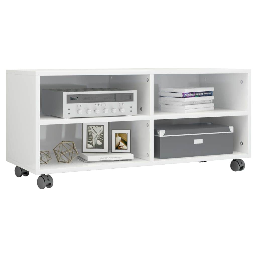 Featuring a trendy yet practical design, this sturdy TV cabinet will definitely become a focal point of your room! The TV cabinet is made of engineered wood, which ensures it sturdiness, durability and long service life. Designed with 4 open compartments, this cabinet offers ample storage space for keeping magazines, books, DVD players, receivers, disks and multi-media devices well organised and within reach. Additionally, it can move around easily with 4 smooth rolling castors and keep firmly in place with 2 lockable castors. The TV cabinet is easy to clean with damp cloth and easy to assemble with included mounting kits.