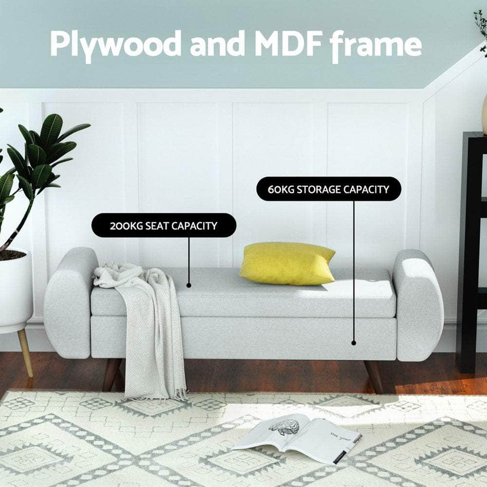 This storage ottoman features an armrest, linen upholstery, and a sturdy plywood and MDF frame. It boasts high-resilience foam padding, ample storage space, metal hinges, oak legs with plastic feet, and is simple to assemble.