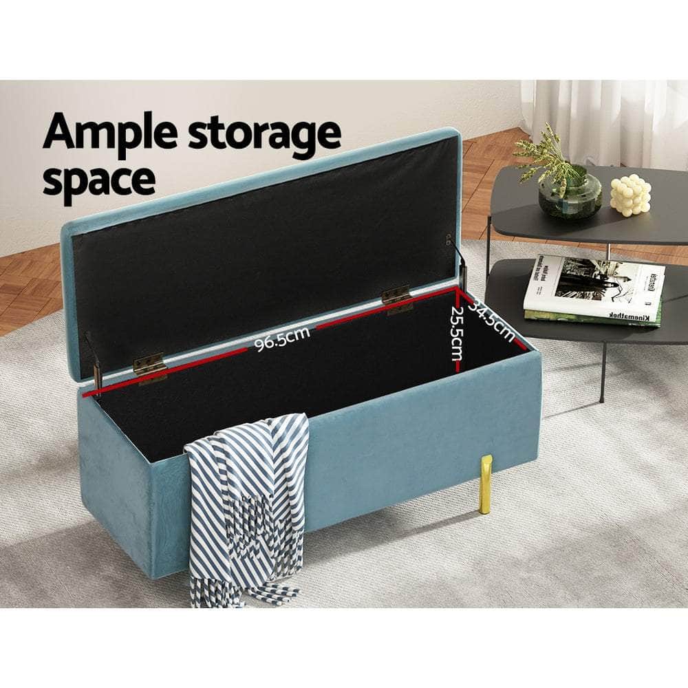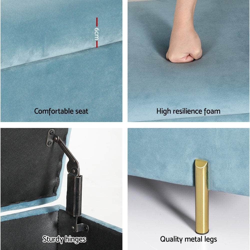 Add a luxury touch to your living room with an Artiss Velvet Storage Ottoman. It has an ultra-soft, high-resilience foam seat upholstered in quality blue velvet, set atop a sturdy wood frame with a 300kg weight capacity and robust hinges. Lift the seat to reveal a generous storage space for up to 60kg worth of blankets, pillows, toys and more. The bench is supported by premium golden metal legs topped with floor protectors to prevent scratches and dents. The whole piece is easy to assemble just follow our simple step-by-step assembly manual. With an Artiss Velvet Storage Ottoman you can easily bring warmth, space and timeless style to any home.
