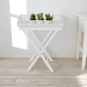 The pot tray table can be used as storage space for flower pots and other decorative items. It will make a great addition to your hallway, workshop, garden, or patio. This tray, with a beautiful cutout design, is detachable and the legs are foldable for easy storage when not in use, which saves you a lot of room. This pot side table is constructed from high quality MDF and pinewood with a white painted finish for durability and sturdiness, giving you years of service.