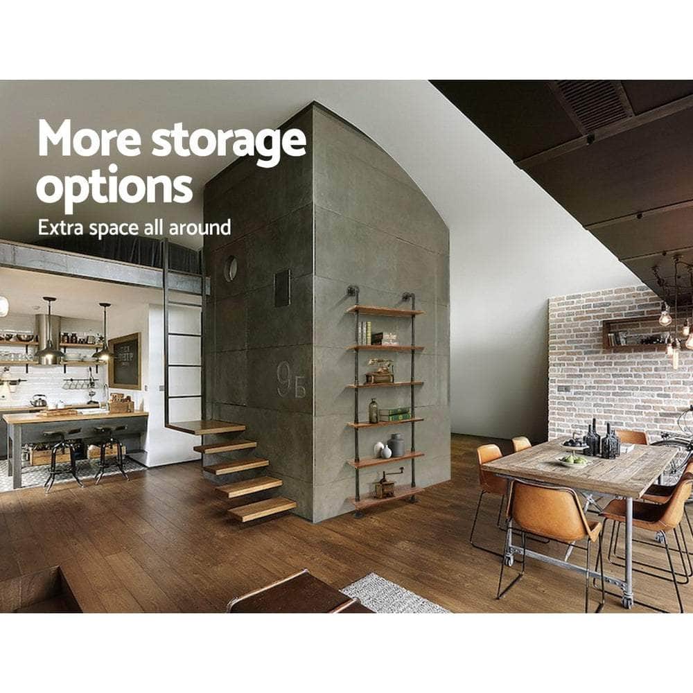 Featuring a rustic industrial 6 level pipe shelf that is perfect for home, office or caf?interior. Made from quality metal pipe and solid timber, the pipe shelf is one of a kind design. It is suitable for both indoor and outdoor applications.