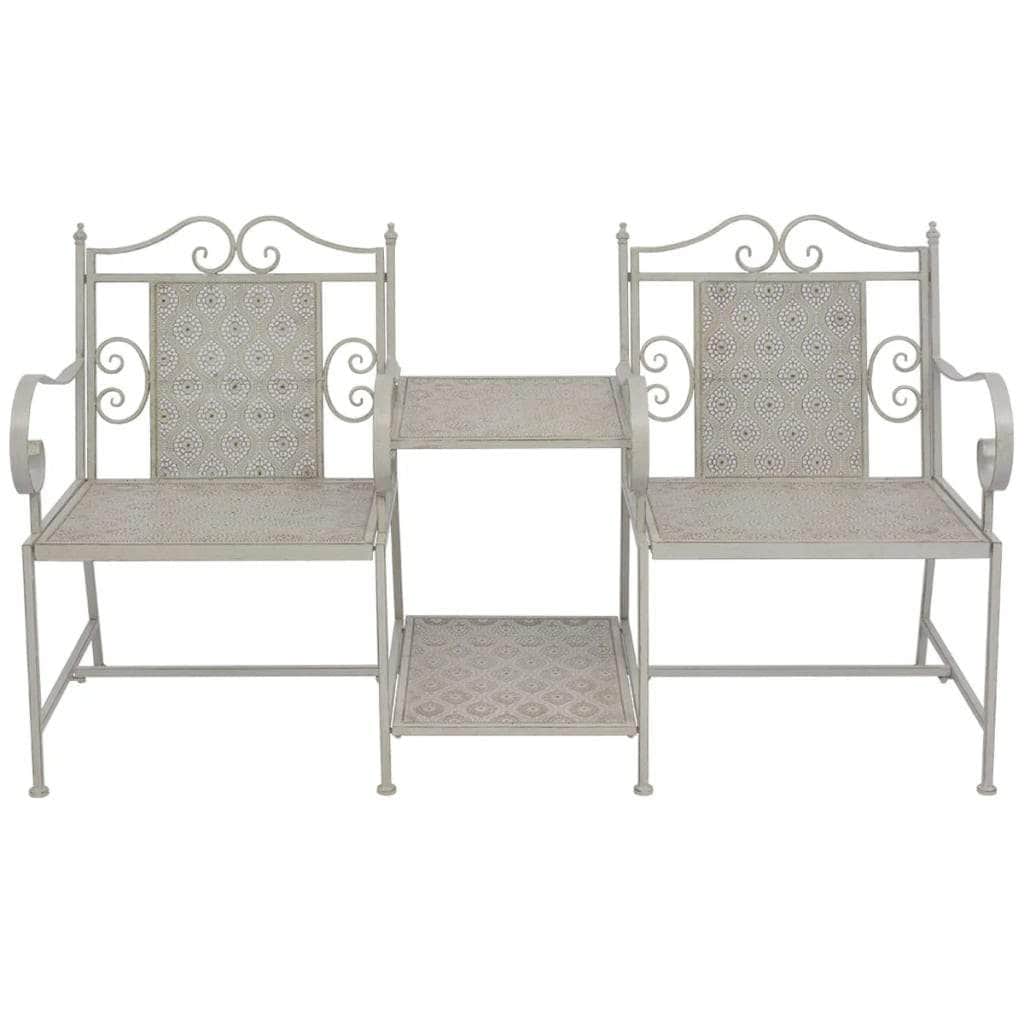 This vintage-style outdoor loveseat will make a practical as well as decorative addition to your garden! The two-seater in British style is made of powder-coated steel, which makes it very stable, durable, and rust resistant. The fancy hand-painted decorations and the rusted finish will make this stylish garden bench stand out in any garden or on any patio or balcony. The integrated table and lower shelf between the seats are ideal for drinks, food, books, and any other items you'd like to keep within reach. Have a nice, intimate conversation with your loved one on this chic love seat!