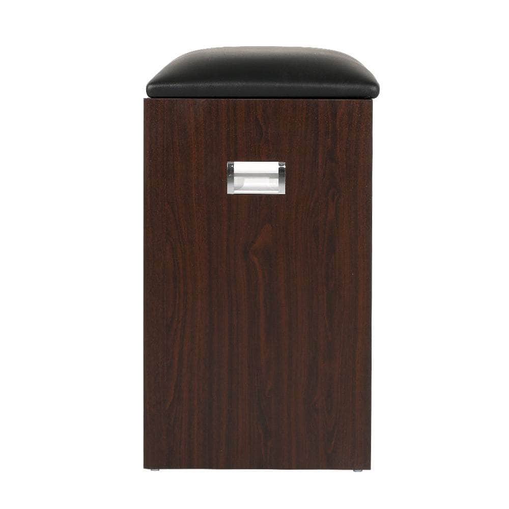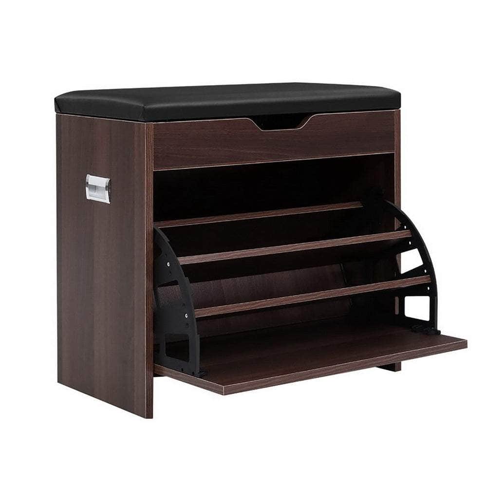 Get yourself a shoe cabinet with an aesthetic difference. Our Shoe Cabinet Bench adds a touch of luxury and multi-functionality to the ubiquitous shoe cabinet. On first impression, it looks just like a plush PU leather stool. Pull down the front panel and you find three tiers of adjustable shoe shelves with ample space for up to 15 pairs of various footwear. There is also a closed storage compartment hidden under the seat, with cut-out handles for easy opening. Made from quality particle board, the bench is sturdy and finished in melamine for durability and easy maintenance. Not least, its thoughtful design means that you can place it in your hallway or entrance for a neat and tidy look that blends seamlessly with your home decor. So remove the clutter and get organised with our shoe cabinet bench. We are sure it will fit right in with your discerning taste for all things stylish and chic.