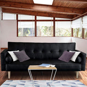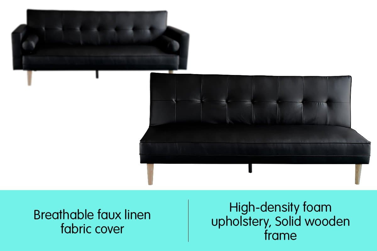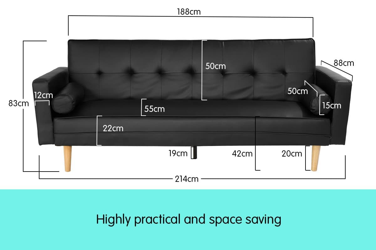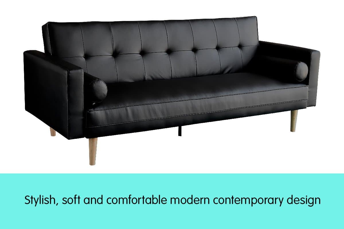 Madison 3 Seater Faux Leather Sofa Bed Couch with Pillows - Black