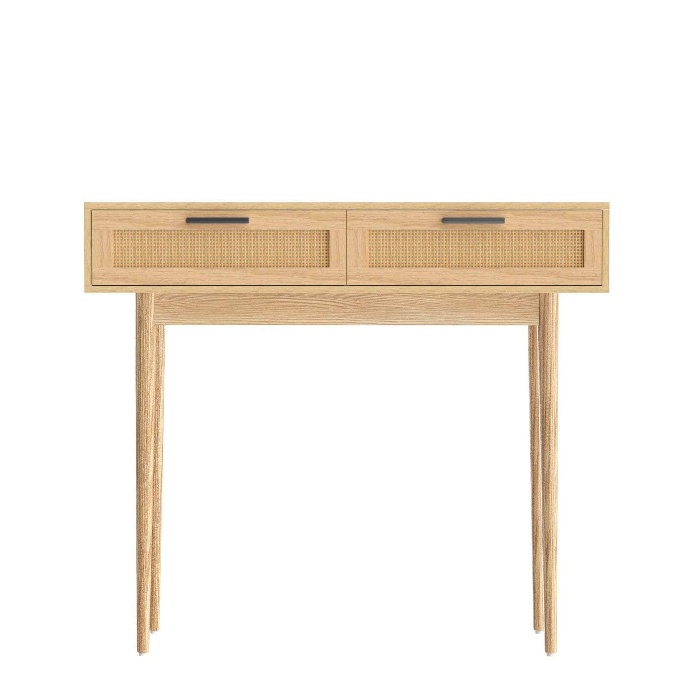 With its exotic chic looks and alluring presence, our Console Table is the perfect entry piece to welcome your visitors with style and panache. Crafted from 15mm thick particle board with paper veneer finish and solid eucalyptus wood legs, this console table is well proportioned and durable in every aspect. Two generous-sized drawers with real rattan fronts and sleek handles provide ample storage space for your home essentials and knick-knacks, while the wide tabletop lets you display your favourite collectibles, memorabilia or anything of your fancy in resplendent style. Be creative with your d��cor, for this exceptional furniture is more than just a hallway stunner. Our console table would be at home anywhere in your domicile.
