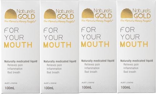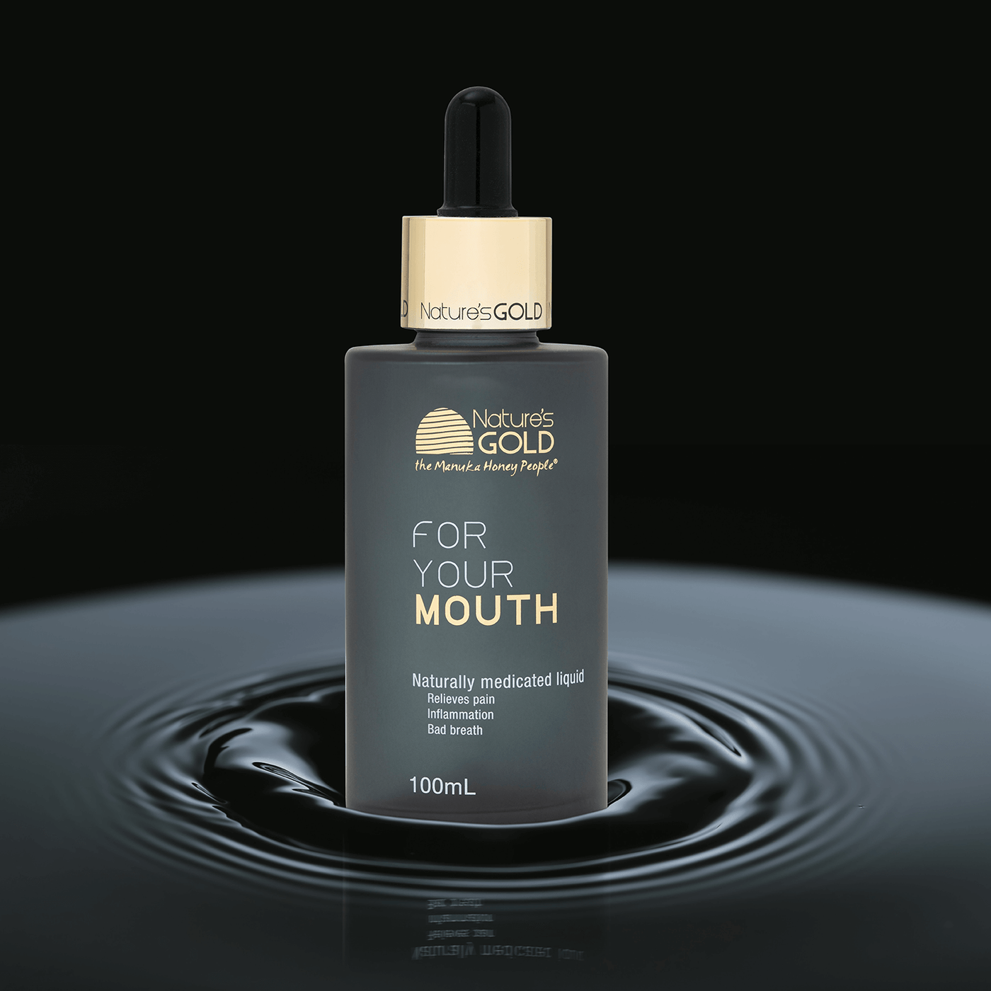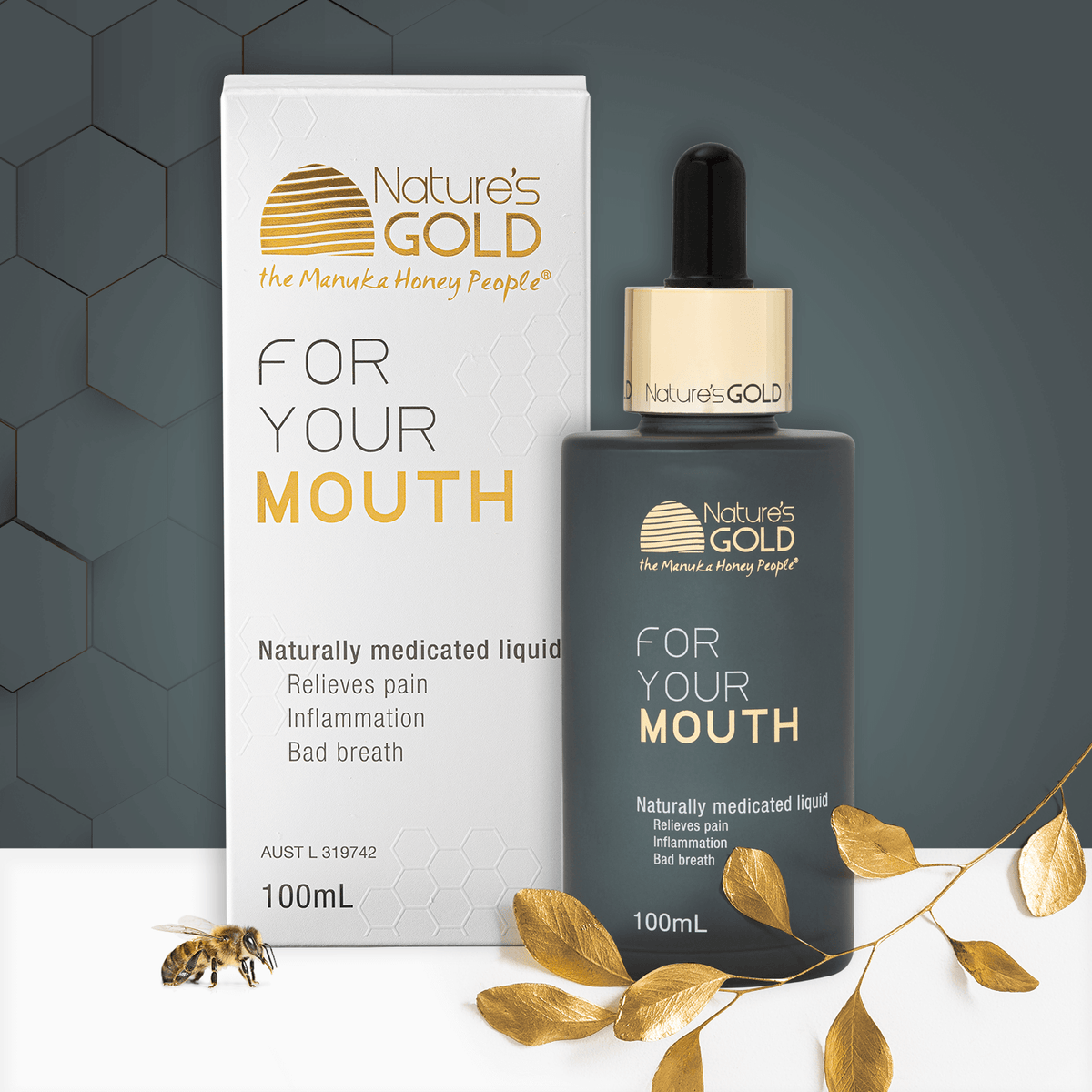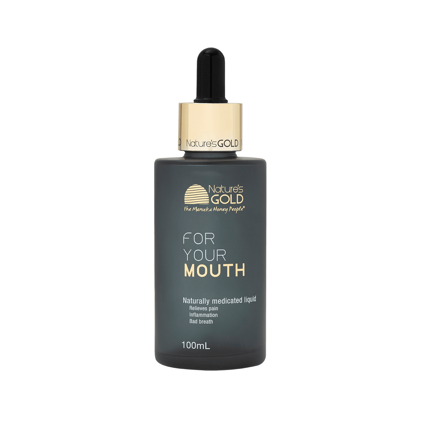 Nature's Gold FOR YOUR MOUTH is a naturally medicated herbal liquid designed to relieve mouth pain, inflammation, and bad breath. It contains Australian Manuka Honey and natural botanical extracts and is listed with the Therapeutic Goods Administration. This daily treatment works immediately to maintain and support oral and gum health. Users can apply it directly to their toothbrush for reducing dental plaque or use it as a mouthwash to relieve symptoms of mild ulcers and bad breath. The product can also soothe and relieve irritation and soreness, reduce dental plaque build-up, and assist with toothache relief. Daily use involves diluting 2-3 ml in warm water, swishing it around the mouth for 1 minute, gargling, and then expelling the liquid. The active ingredients include purified Australian Manuka Honey, Calendula officinalis flower, peppermint oil, clove bud oil, and Benzoin Sumatra. This 100% Australian family-owned product is packaged in a recyclable glass jar.